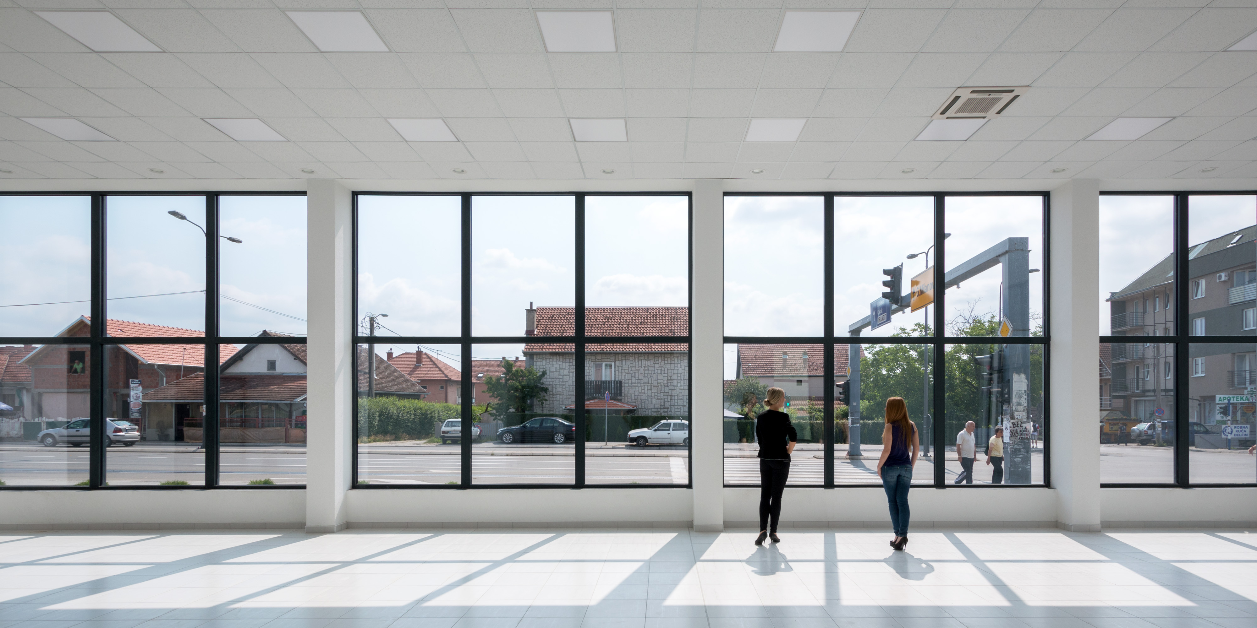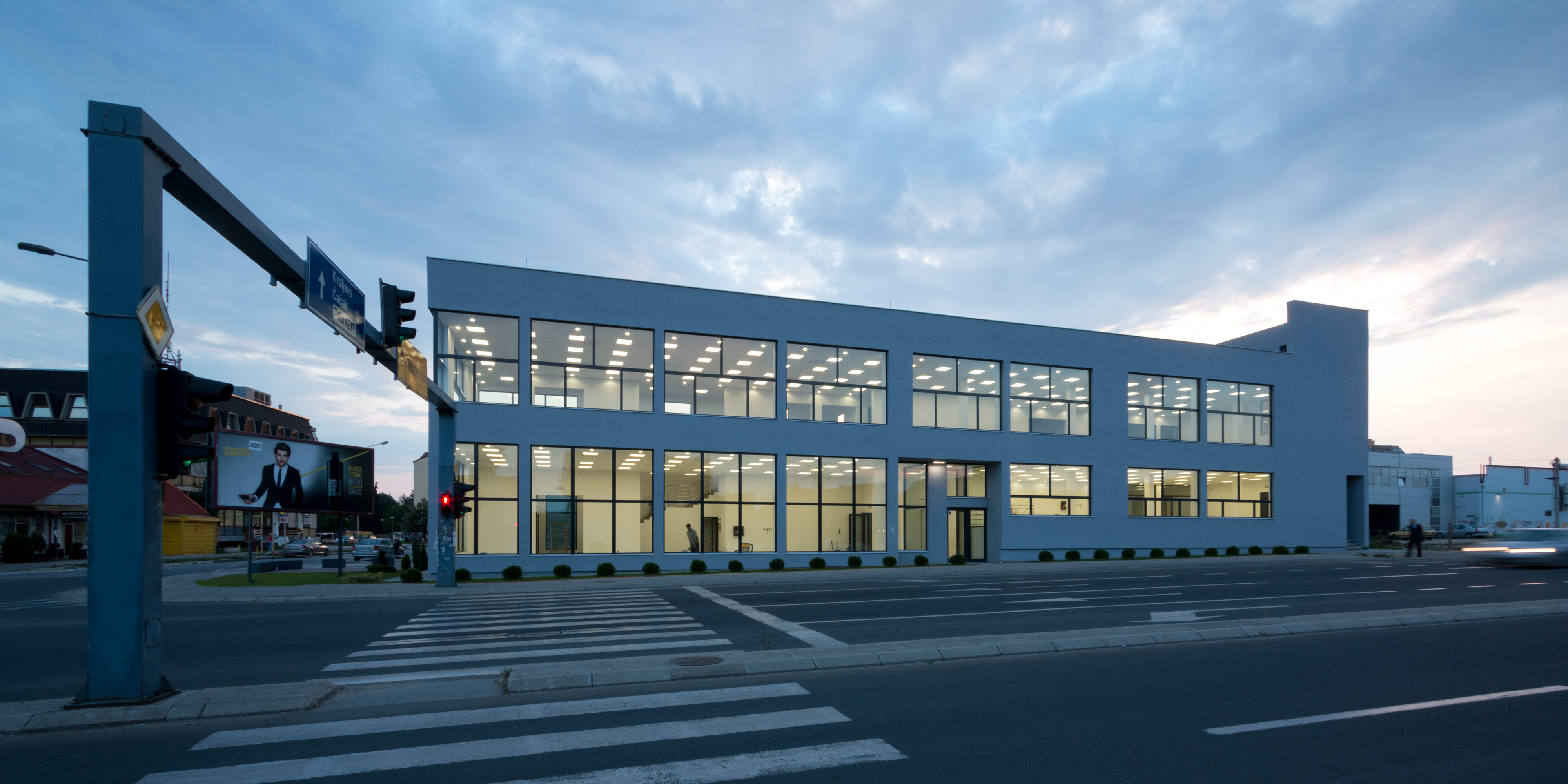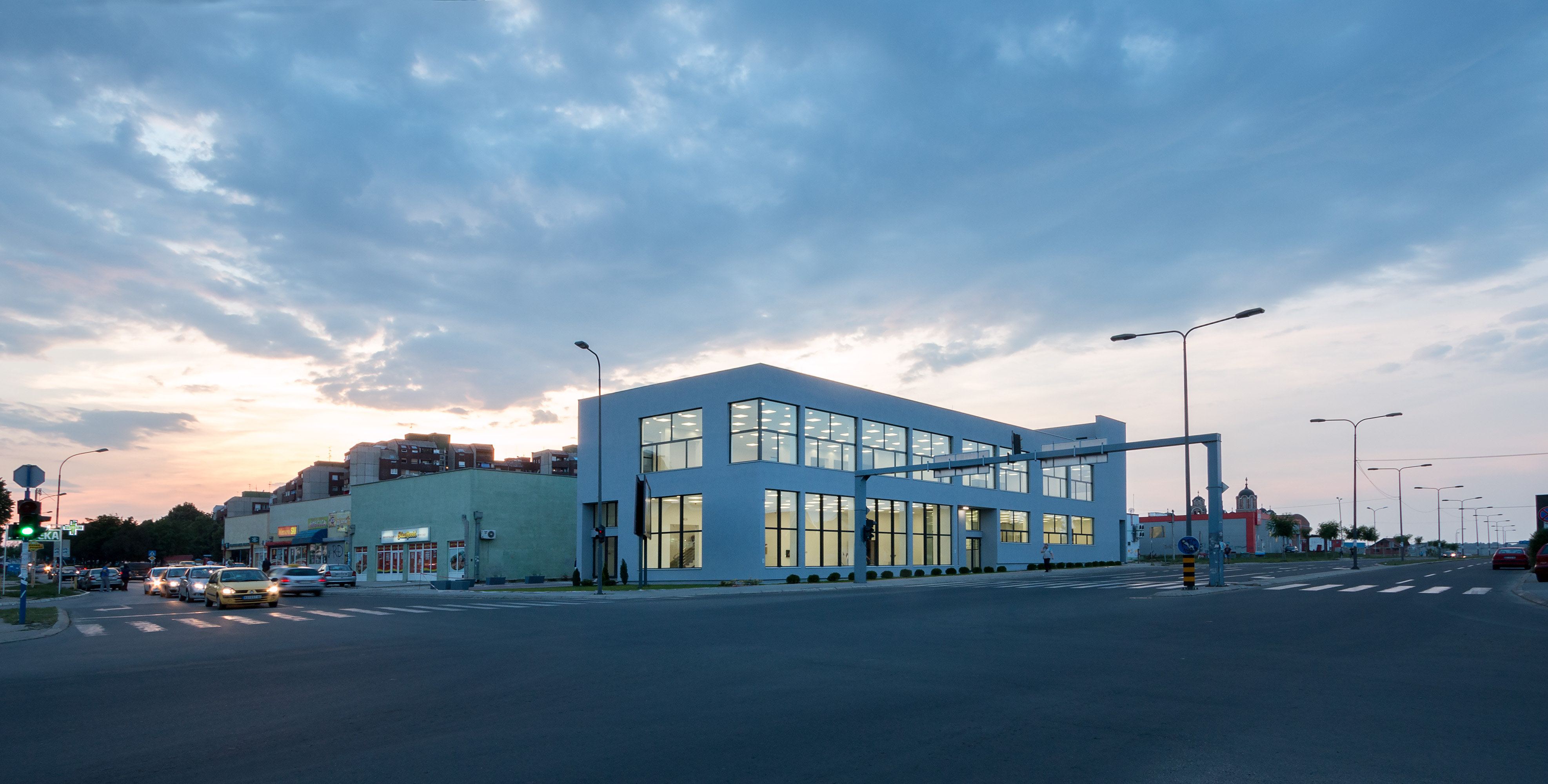 In the specific chaotic context which consists of the church, market hall, supermarket and shopping centre within the same block and in neighbouring blocks – the gas station, post office, small houses and high density housing – this new typology of a commercial building is a lo-cost showroom for the local company and their office space that we designed to sit proudly on the corner of this multifuncional block creating the visual order in this environment.