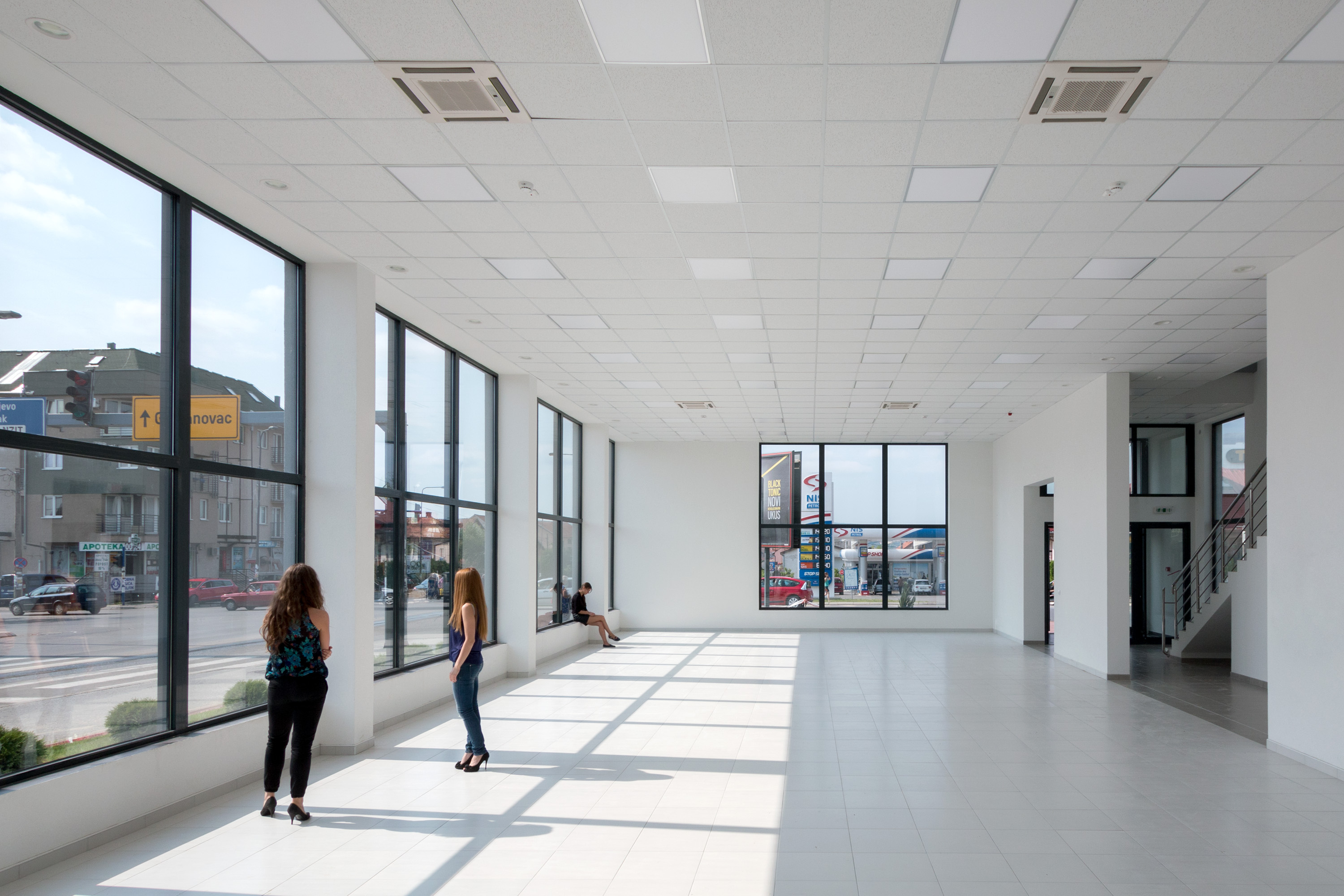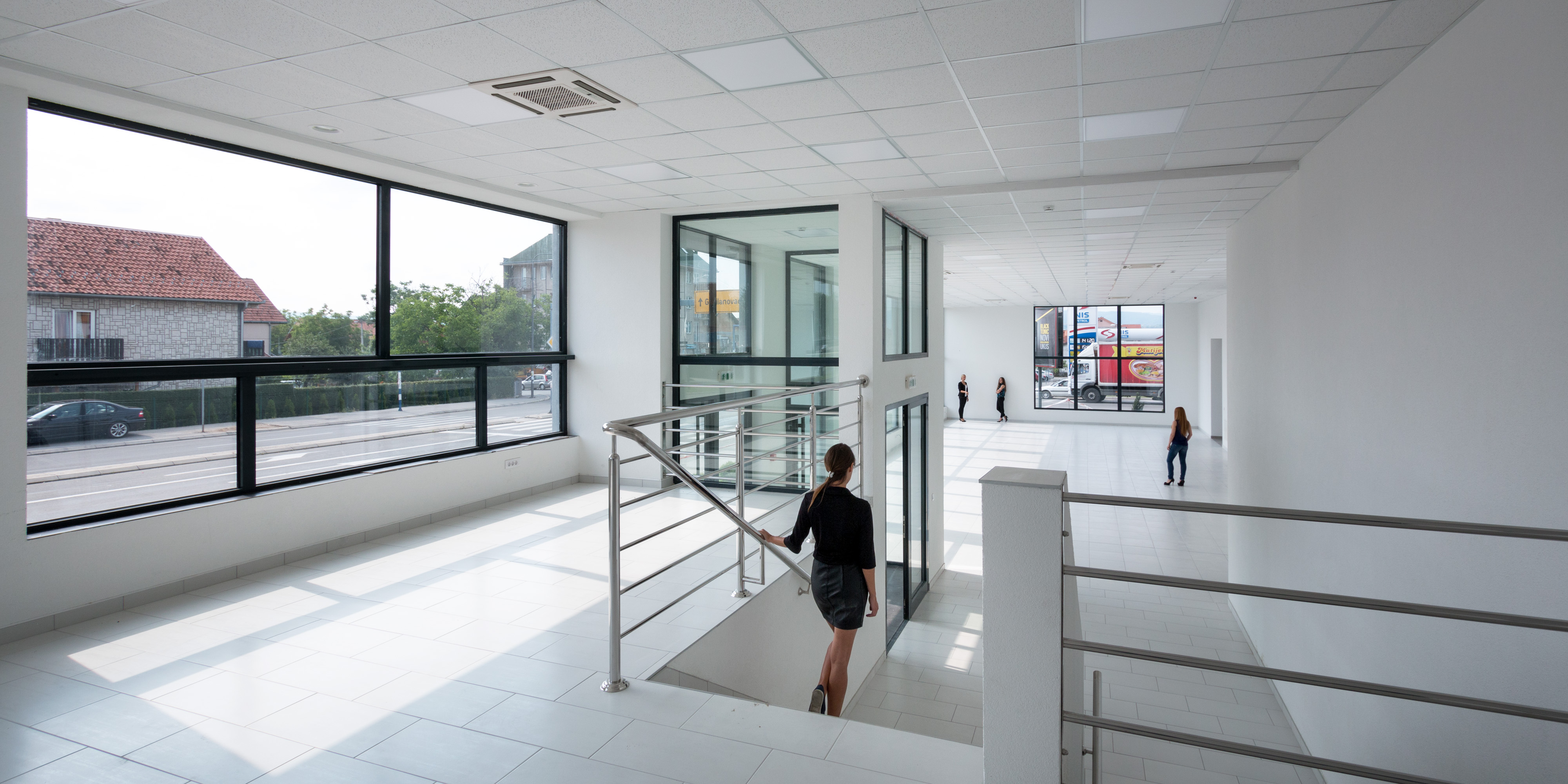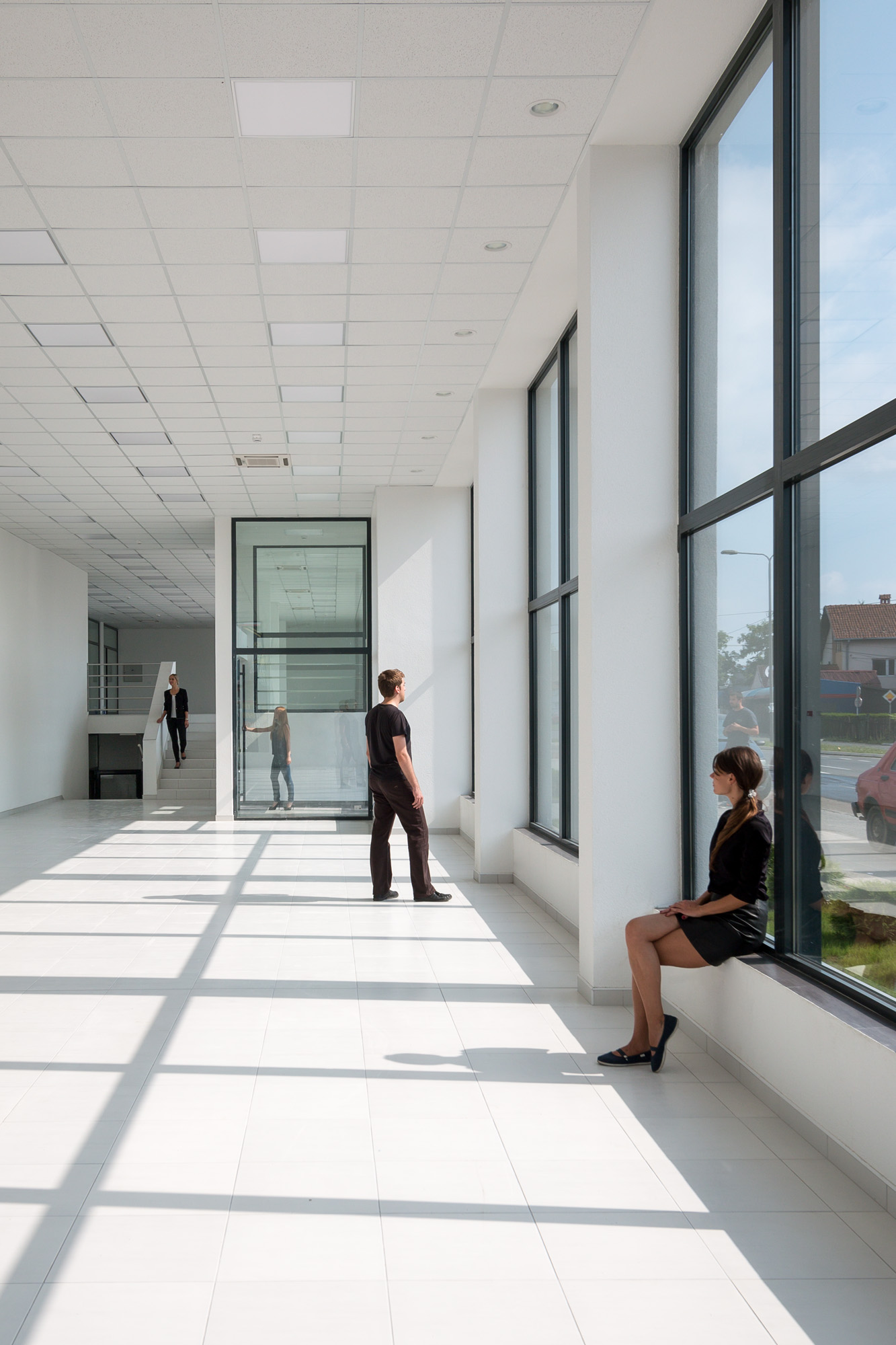 The challenge of the project was to come up with very limited resources and to achieve a quality architecture that comfortably handles the basic architectural elements, such as columns, walls, slabs, and openings, in order to create an airy interior with purified structure appropriate to the showroom and, relatively strict, business-like exterior of the building with rhythmic facade openings.