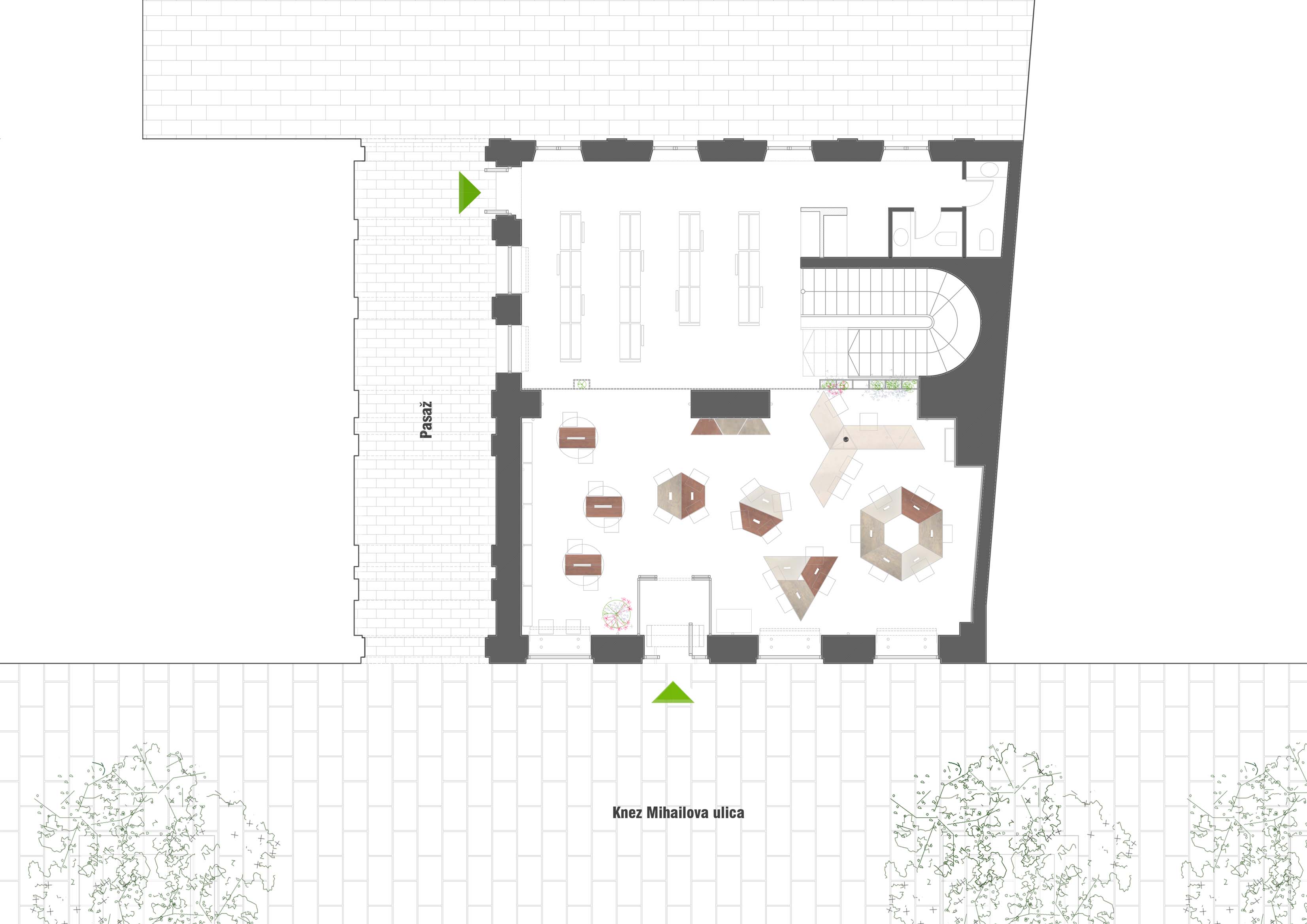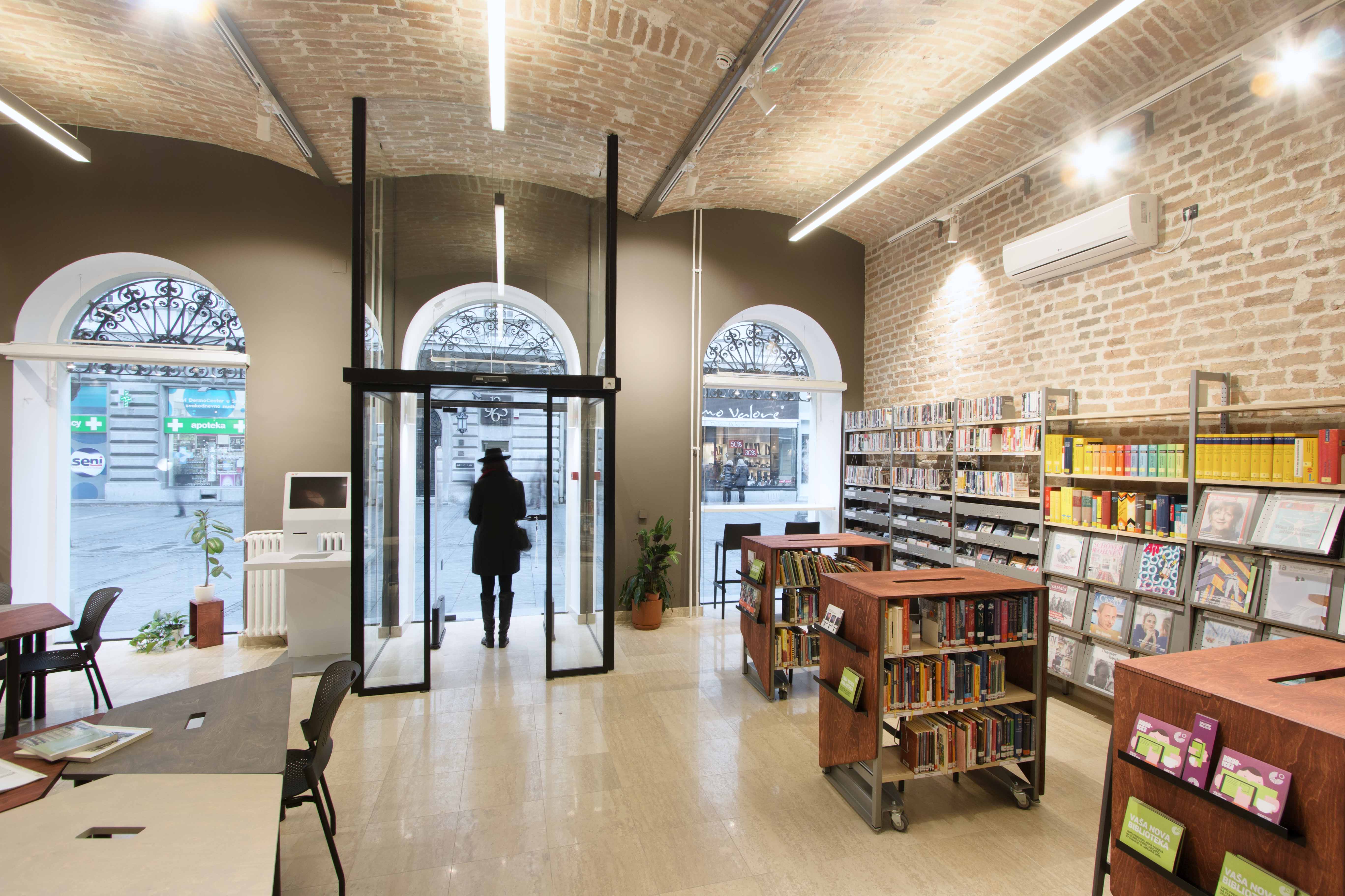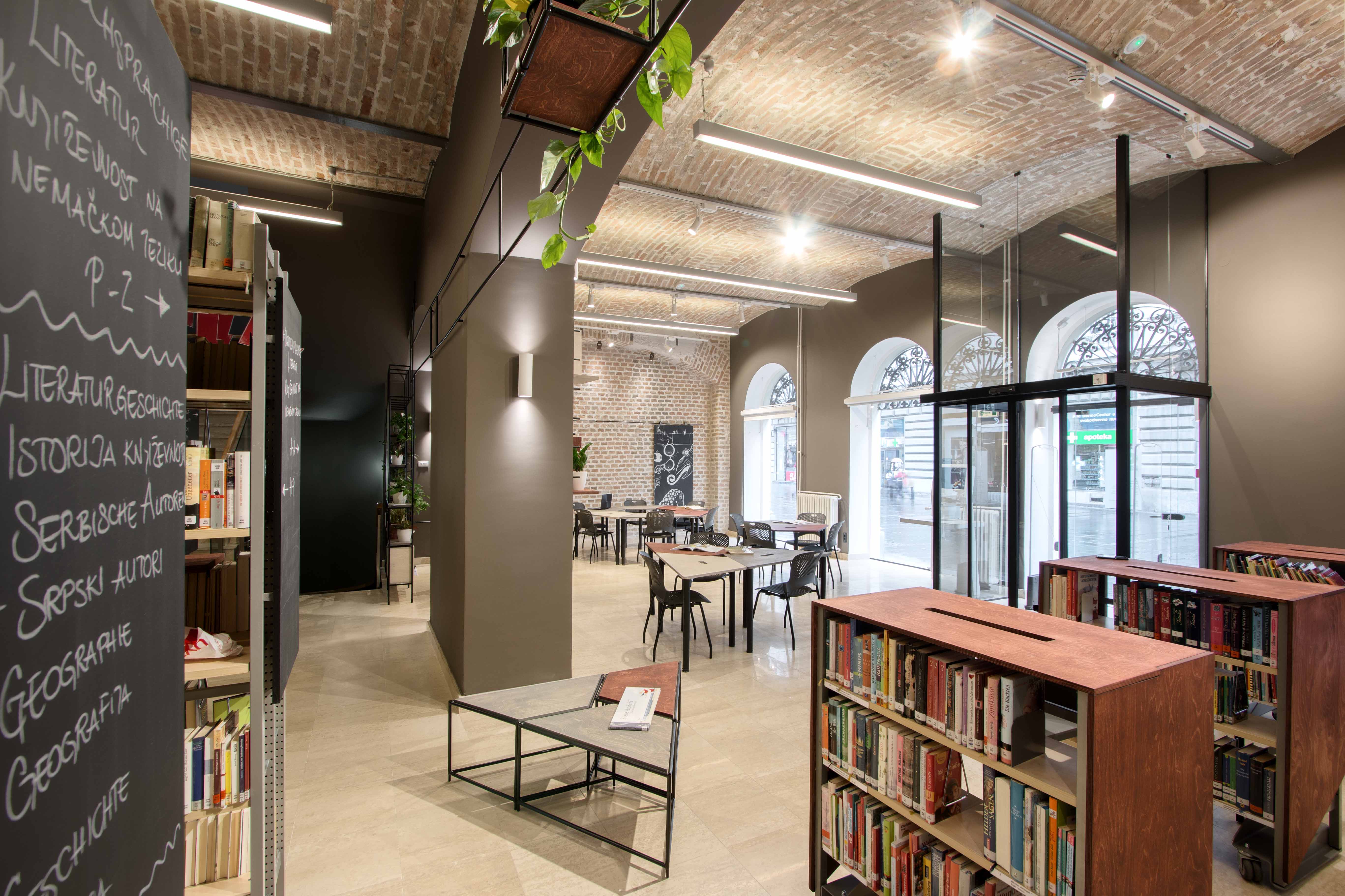 Library space is divided into four areas: ‘infrastructure’, ‘superstructure’, ‘coulisse’ and ‘interface’. Each area has its own functional and spatial characteristics, altogether forming a unity. The ‘superstructure’ zone, part of the library space oriented towards the Knez Mihailova Street, represents the focus of the project and offers various scenarios. The primary function of this space is a reading room which can easily be transformed into a space for lectures, workshops, exhibitions and different events organized by the cultural institute. Multi-functionality is achieved by innovative solutions of modular interior elements that allow flexibility and transformability of the space. There is a possibility of changing the ambient using different lighting modes. The ‘infrastructure’ zone covers the service areas, a vertical communication and bookshelves. The ‘coulisse’ zone represents a line between ‘infrastructure’ and ‘superstructure’, which includes a wall with two arched passages and a central column. This area is the lining for the modular green wall enriching the library space. The ‘interface’ zone consists of windows, oriented towards the Knez Mihailova Street and the passage, communicating the library space with passers-by.