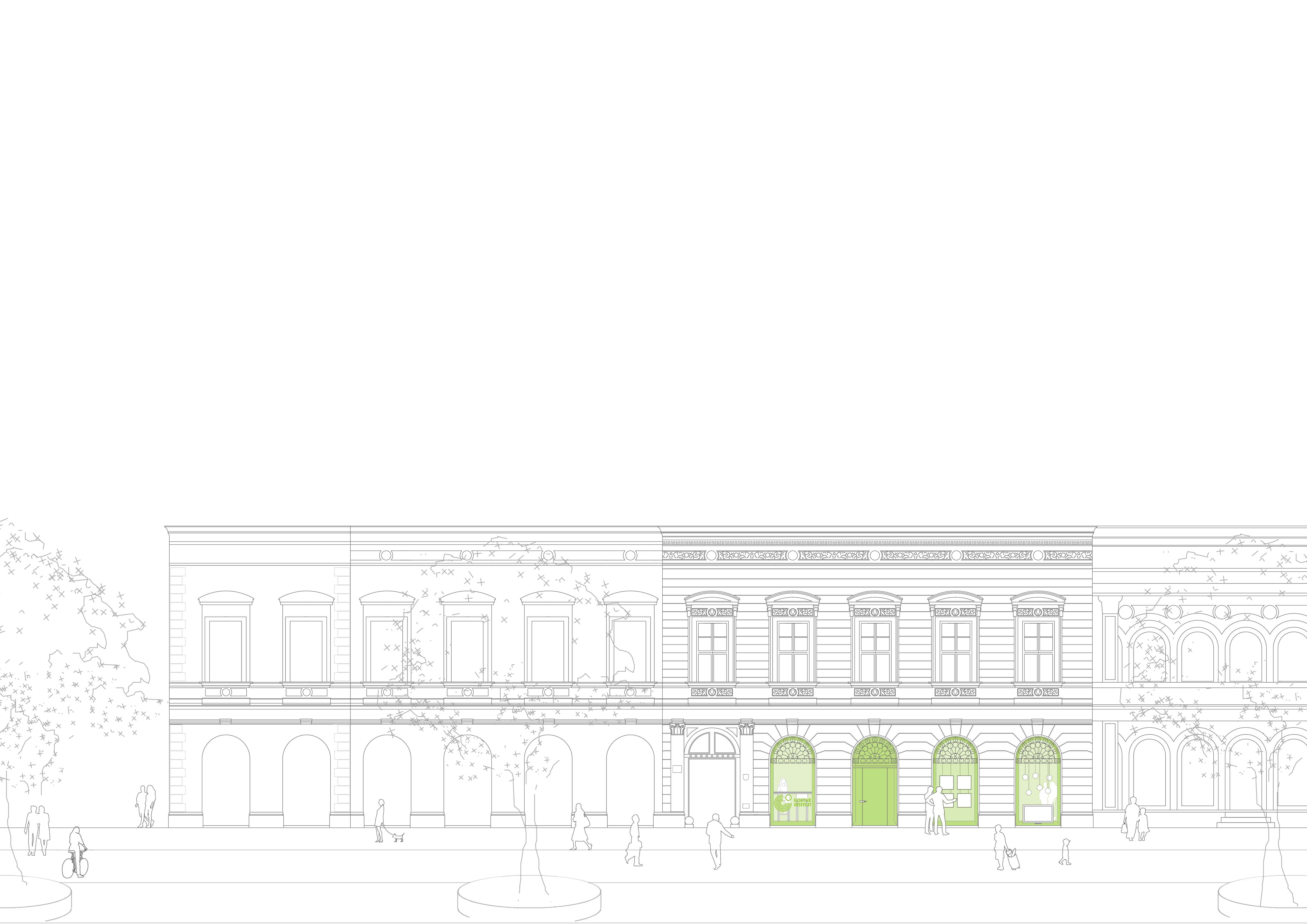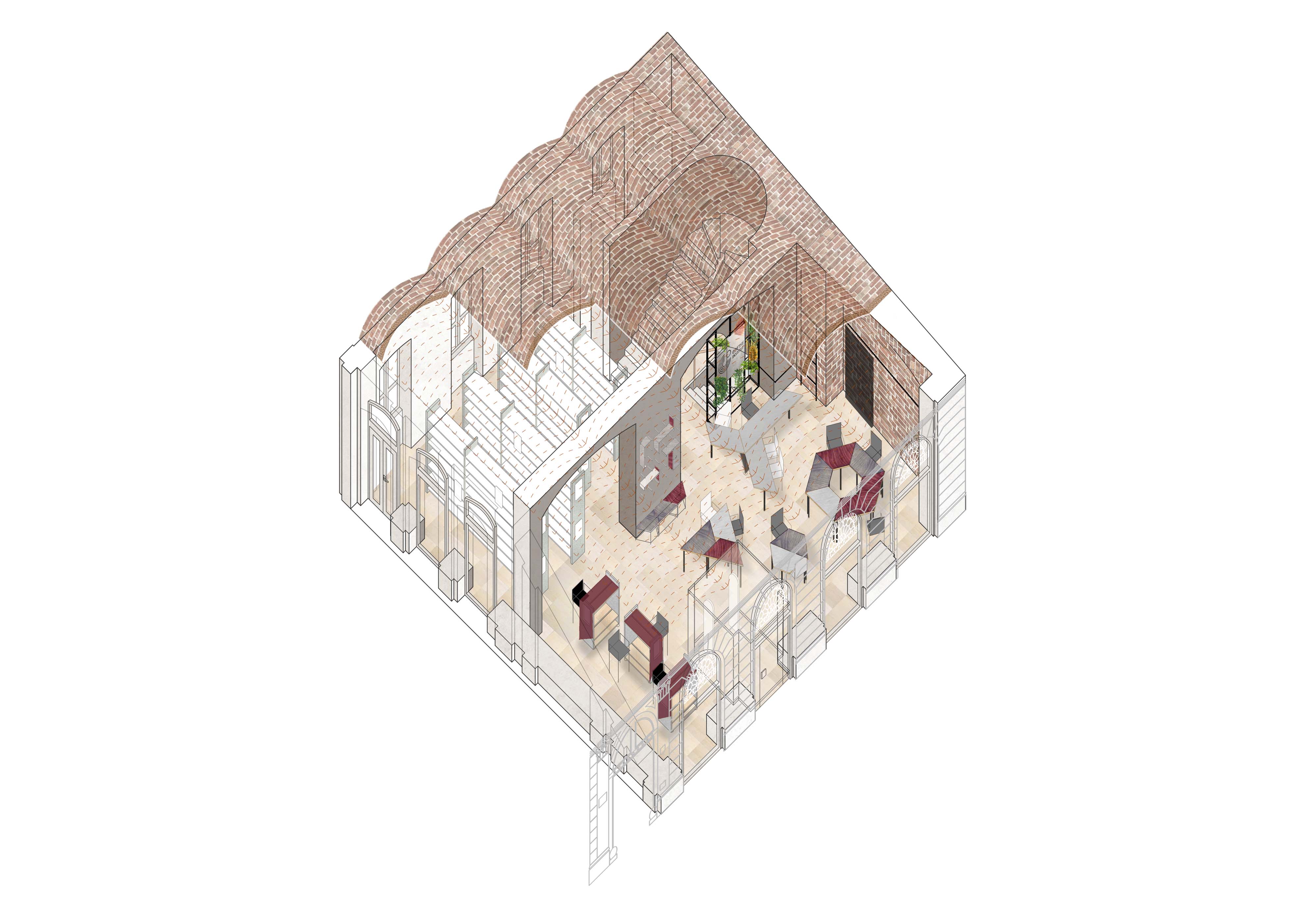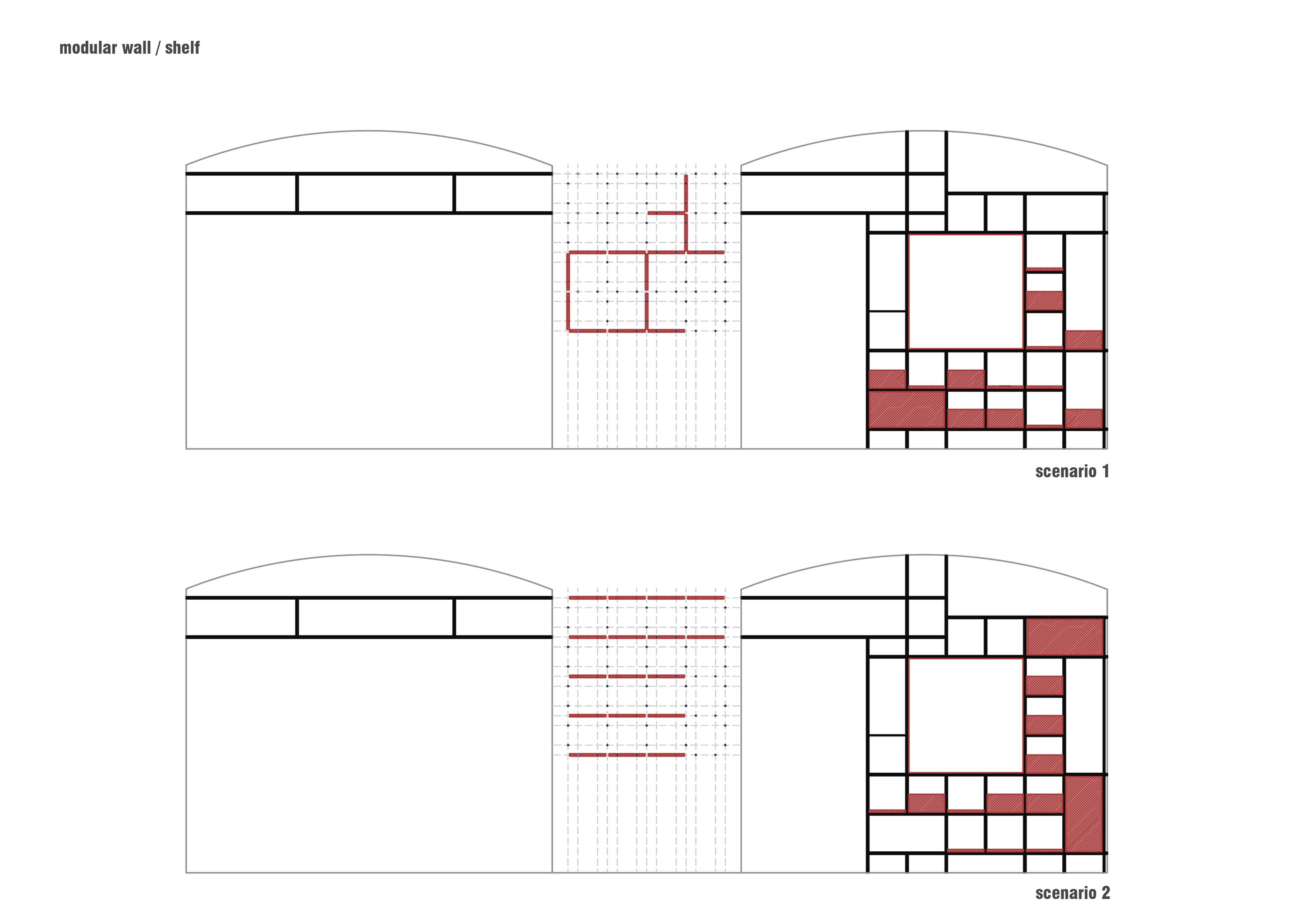 Library space is divided into four areas: ‘infrastructure’, ‘superstructure’, ‘coulisse’ and ‘interface’. Each area has its own functional and spatial characteristics, altogether forming a unity. The ‘superstructure’ zone, part of the library space oriented towards the Knez Mihailova Street, represents the focus of the project and offers various scenarios. The primary function of this space is a reading room which can easily be transformed into a space for lectures, workshops, exhibitions and different events organized by the cultural institute. Multi-functionality is achieved by innovative solutions of modular interior elements that allow flexibility and transformability of the space. There is a possibility of changing the ambient using different lighting modes. The ‘infrastructure’ zone covers the service areas, a vertical communication and bookshelves. The ‘coulisse’ zone represents a line between ‘infrastructure’ and ‘superstructure’, which includes a wall with two arched passages and a central column. This area is the lining for the modular green wall enriching the library space. The ‘interface’ zone consists of windows, oriented towards the Knez Mihailova Street and the passage, communicating the library space with passers-by.