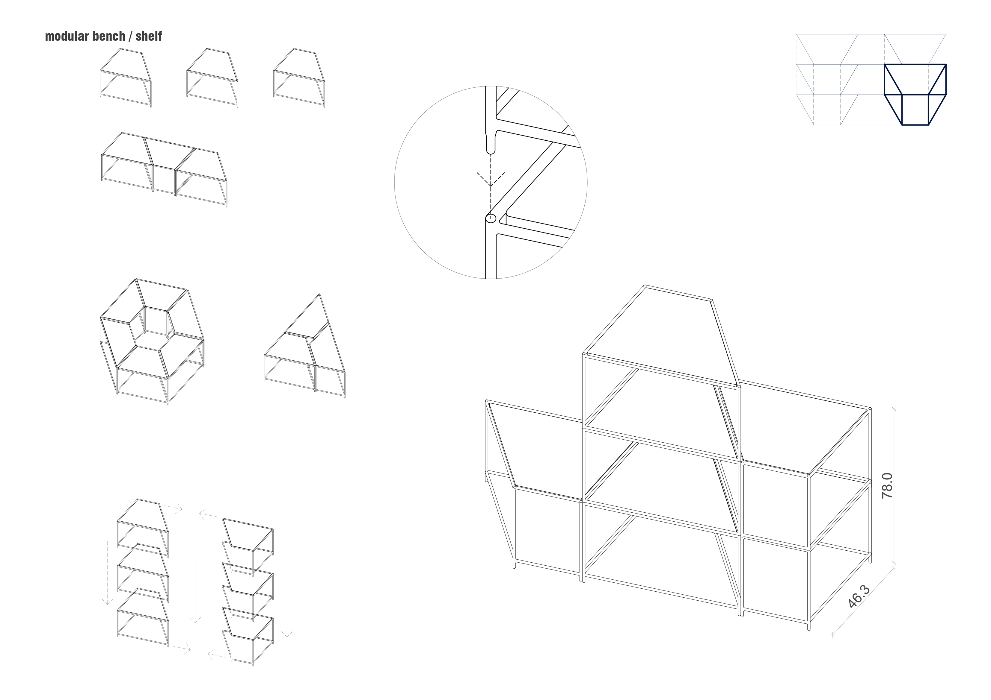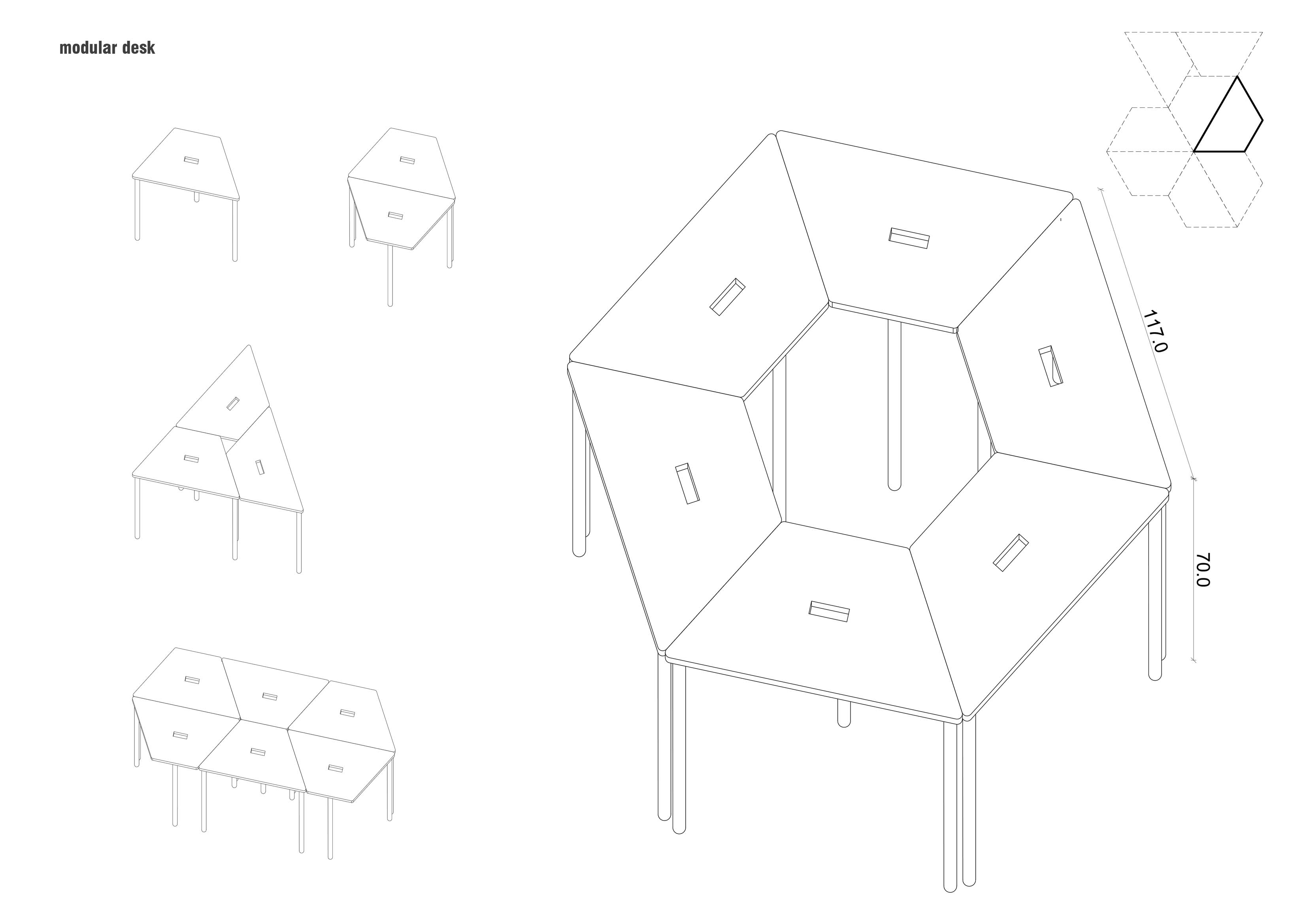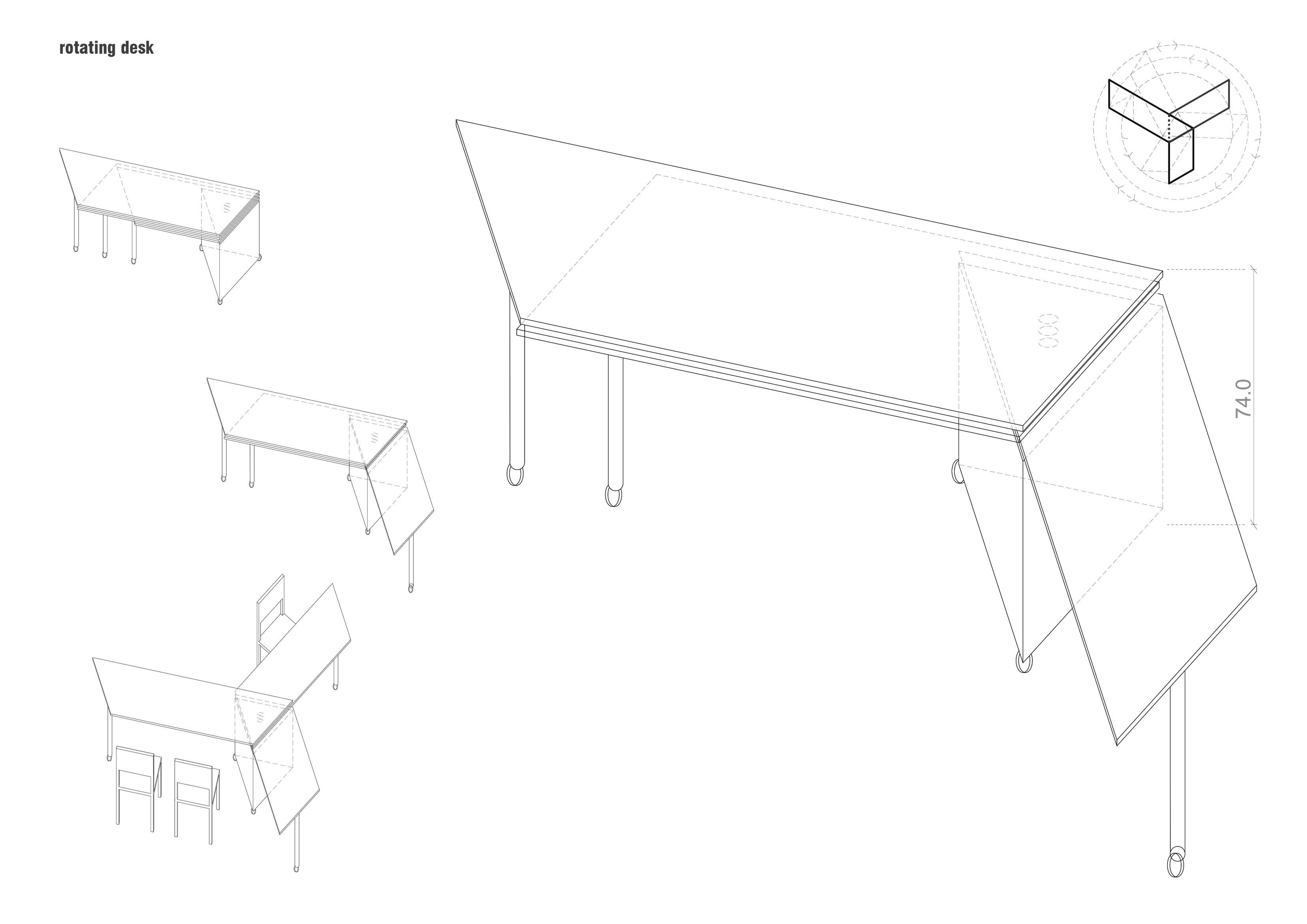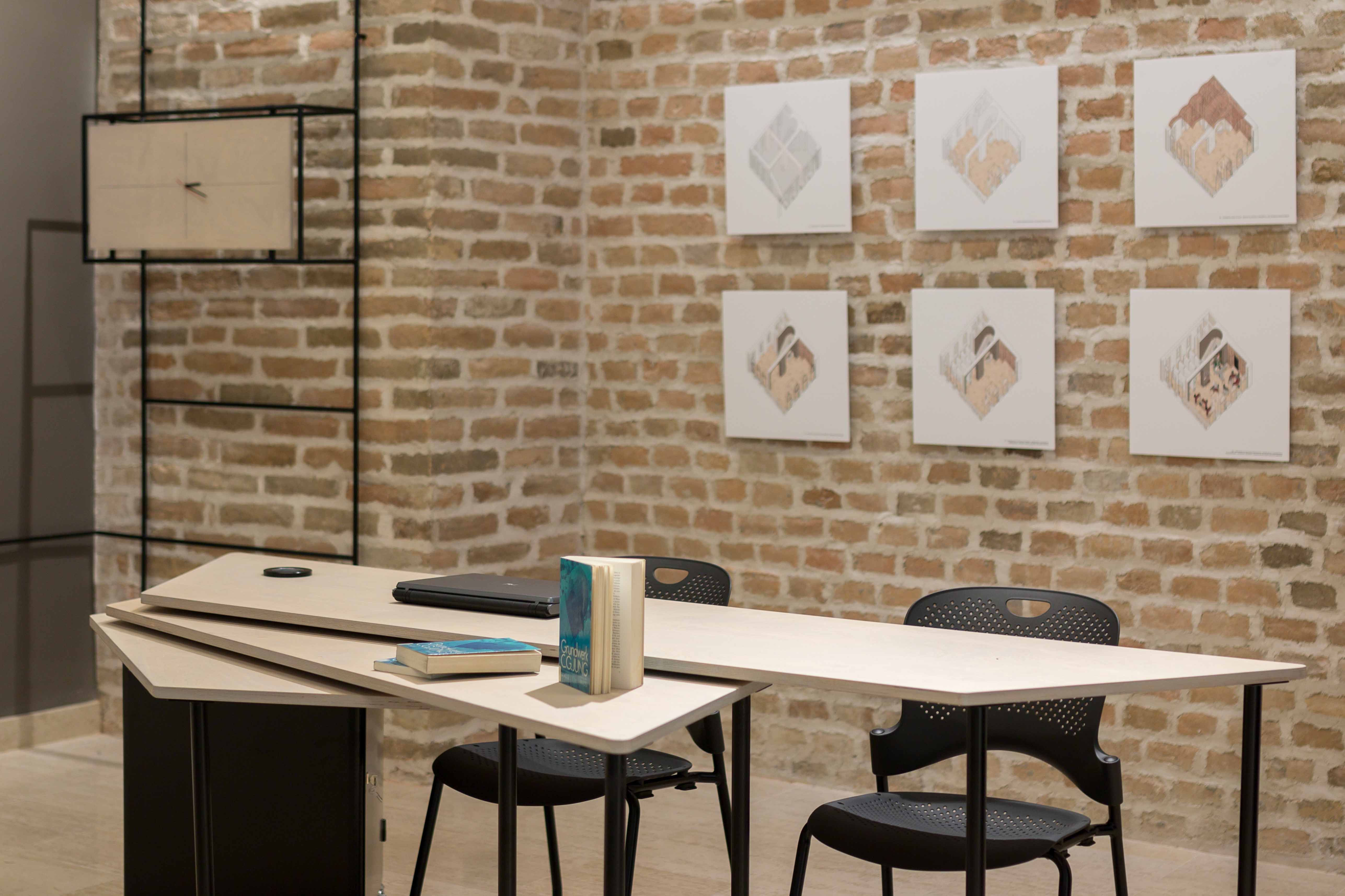 Furniture elements are mainly designed by URED architecture studio fulfilling the requirements of the library space. The design principles are derived from need for a multifunctional space – flexible, transformable, modular and easy to store furniture. Trapezoid desks, placed in the reading room, are one of the former designs made by URED studio, whilst a rotating reception table, a trapezoid bench/shelf, as well as a modular shelving system were designed for this occasion. The transformability of the elements provides the possibility of different visual experiences of the space. The furniture is made in different tones of plywood that give a certain dynamic while being complementary with the color palette that is used in the space.