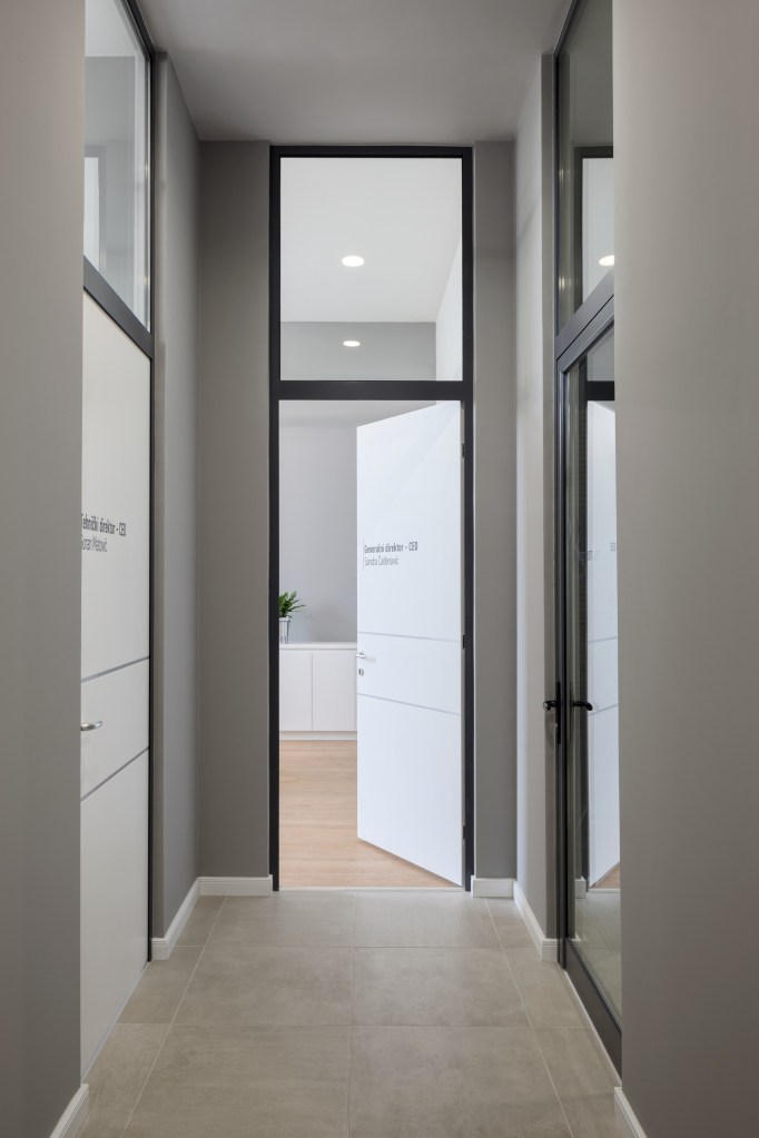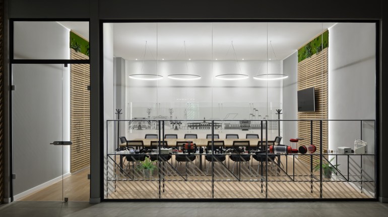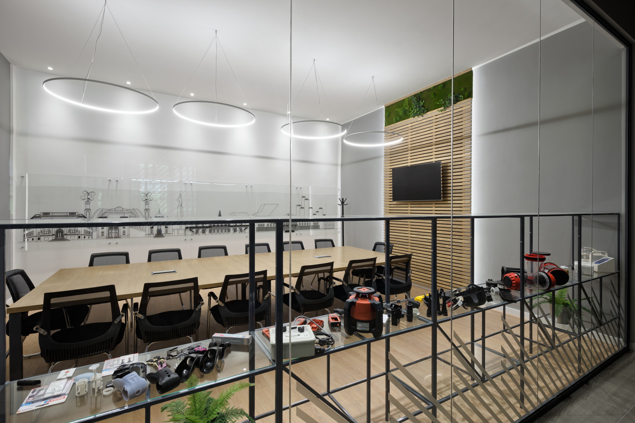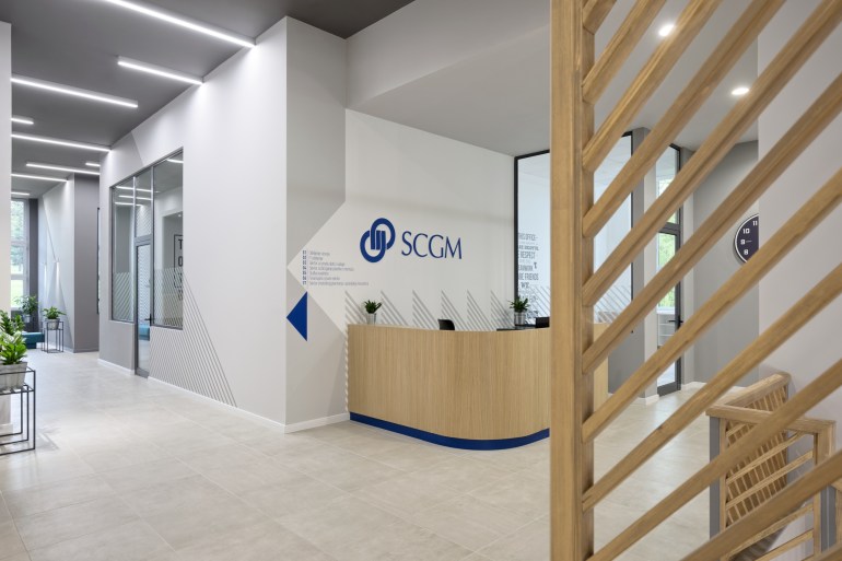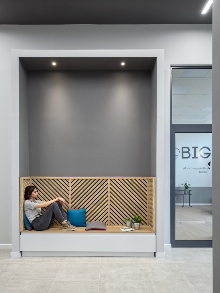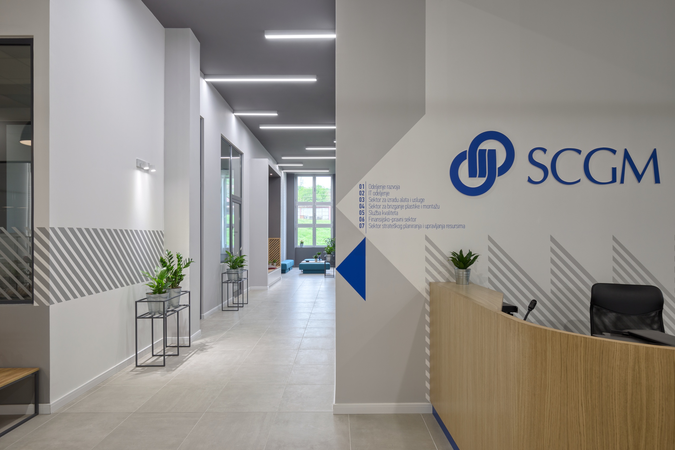 The former production hall of a textile factory is transformed through the adaptive reuse and interior design for the needs of the new owner, company SCGM d.o.o. which specializes in plastic injection molding, prototype design, construction and tool making. The production plant of the company extends over 3600 m2 of this hall, and the office space headquarters is about 600 m2. Functional and aesthetic delineation of the business part from the production was achieved by introducing a new entrance zone and the steps that penetrate deep into the building. The interior of the office space is conceived by a clear separation into two zones, one is available for visitors, and the other is exclusively for employees. The project brief was to create a comfortable and representative space to welcome large international clients from the industry, but with a budget that is more appropriate for local economic conditions. Almost all the furniture, lighting fixtures, wooden partitions and even interior doors are custom made by a local company. The skills of local craftsmen involved in this project inspire the creativity of the company in which the core values are design and manufacturing processes.