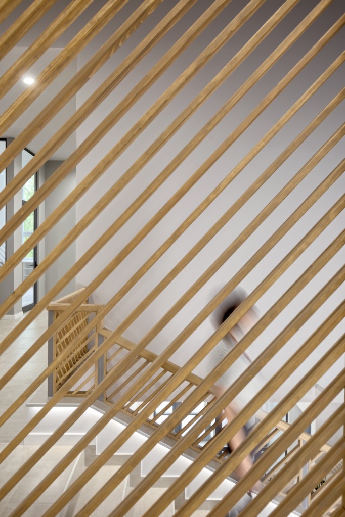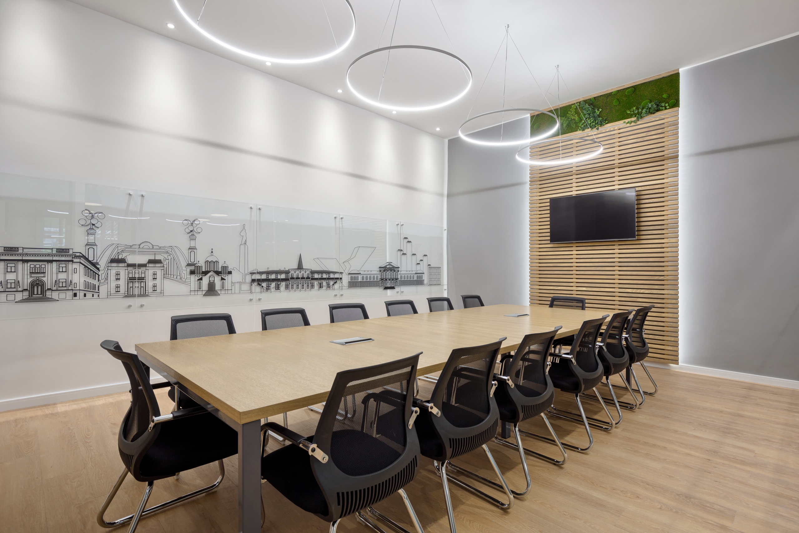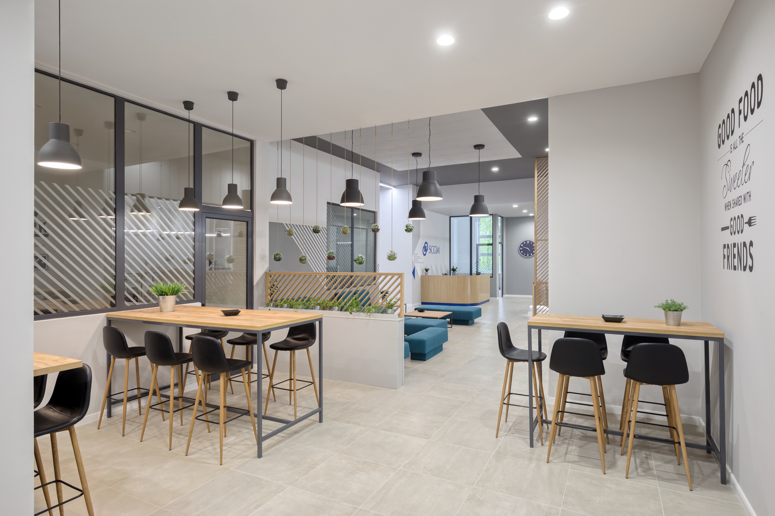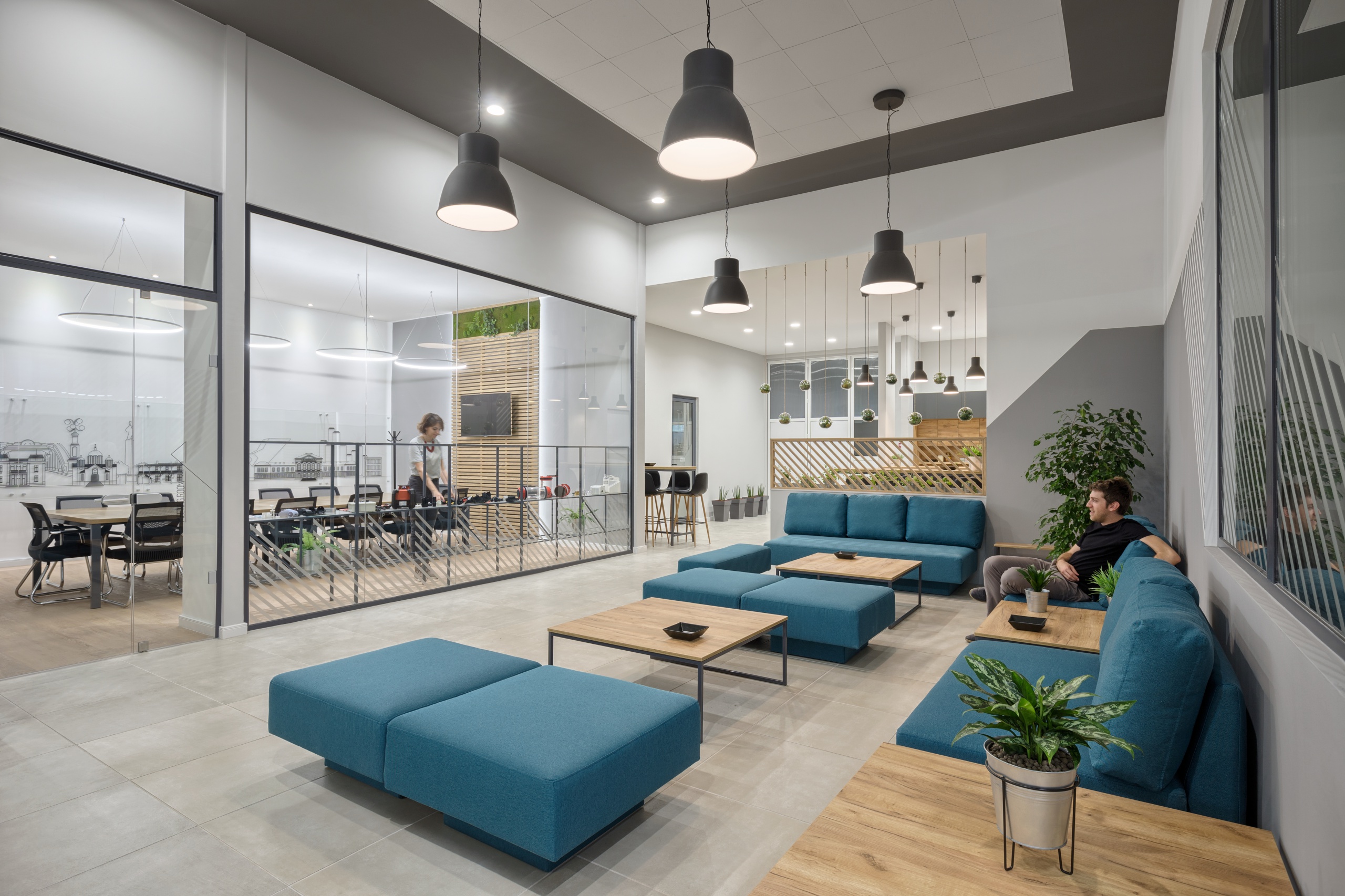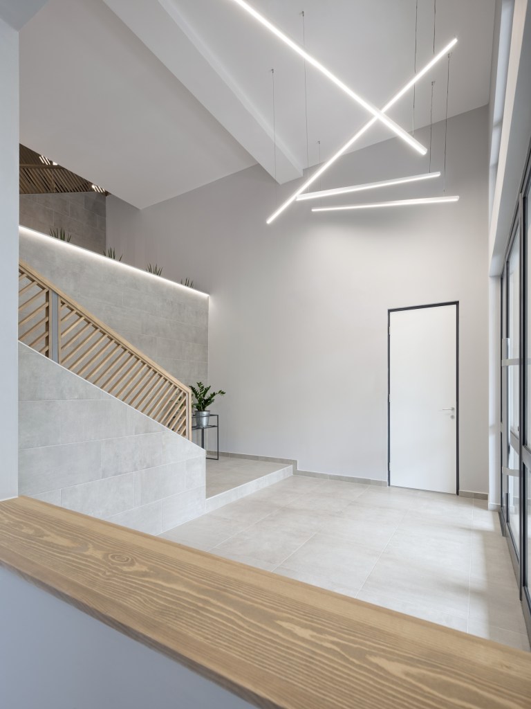 The former production hall of a textile factory is transformed through the adaptive reuse and interior design for the needs of the new owner, company SCGM d.o.o. which specializes in plastic injection molding, prototype design, construction and tool making. The production plant of the company extends over 3600 m2 of this hall, and the office space headquarters is about 600 m2. Functional and aesthetic delineation of the business part from the production was achieved by introducing a new entrance zone and the steps that penetrate deep into the building. The interior of the office space is conceived by a clear separation into two zones, one is available for visitors, and the other is exclusively for employees. The project brief was to create a comfortable and representative space to welcome large international clients from the industry, but with a budget that is more appropriate for local economic conditions. Almost all the furniture, lighting fixtures, wooden partitions and even interior doors are custom made by a local company. The skills of local craftsmen involved in this project inspire the creativity of the company in which the core values are design and manufacturing processes.