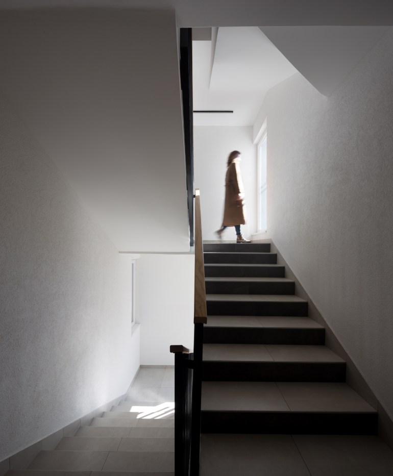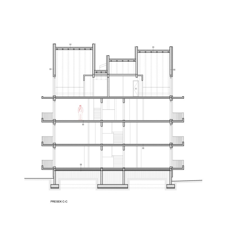 The aggravating circumstance and additional problem that affected design are that both neighboring buildings on the sides of the plot have stepped within the plot of the K16 building with their size or just the roof overhang, which made it impossible to completely fulfill the required typology of construction in a row. By distancing K16 from the neighboring buildings, a disjointed floorplan was obtained, adapted to the surrounding area. Parking is solved in the front yard, which also represents the main yard due to its size and southern orientation. Apart from parking, the yard is also intended for other activities – for children playing, gathering, and social life maintaining. The entrance to the building and the common staircase space has been carefully designed so that they have natural lighting and ventilation, and the materialization, lighting design, and marking of the floors have been integrally solved through a detailed project elaboration.