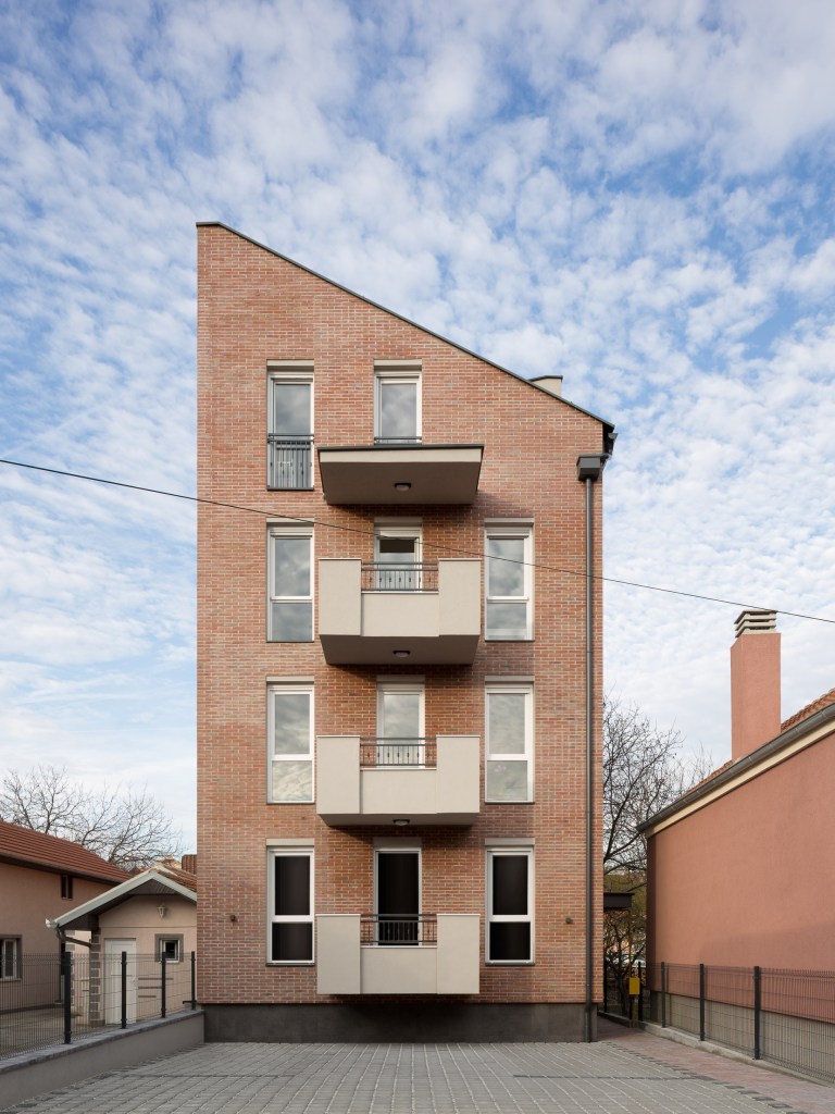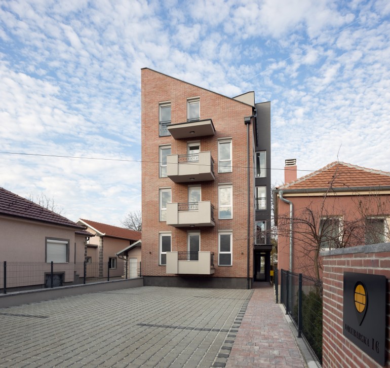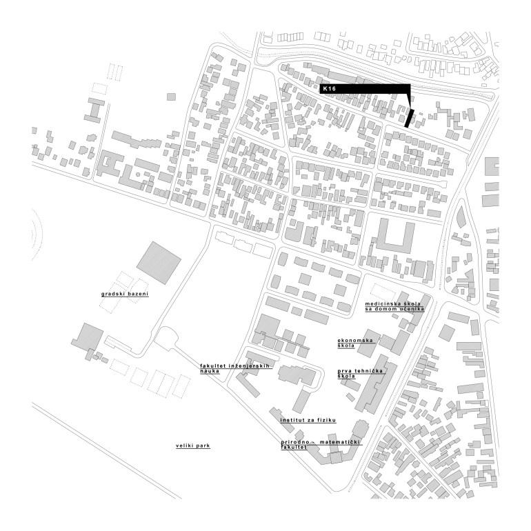 The residential building in Kolubarska Street No. 16 is surrounded by detached family houses and facilities with rooms and apartments intended for renting to students. Having in mind the position of the building in the city, surrounding area, the small distance to schools and faculties, K16 is designed as six – apartments, with two apartments on each floor – four smaller apartments of about 42m2 and two duplexes of 75 and 85m2. Despite the small areas, the interior space has the quality of many larger apartments thanks to the well-proportioned rooms.