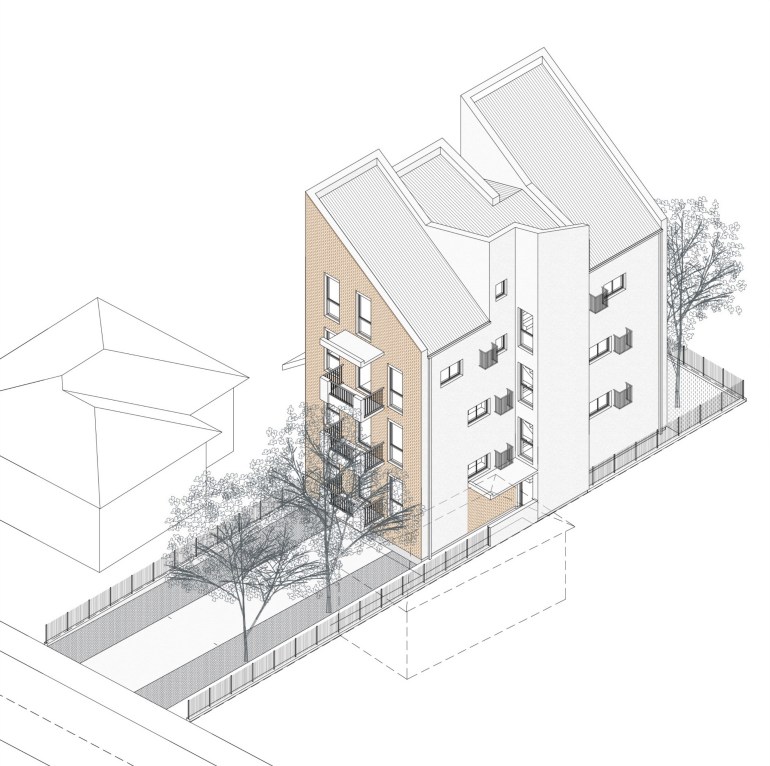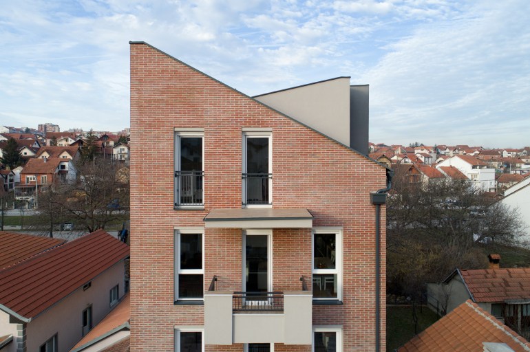 Udaljavanje od susednih objekata je omogućilo realizovanje projektnog zadatka koji je definisao da zgrada ima isključivo kos krov, formirajući na taj način glavni motiv oblikovanja zgrade. Obzirom da krovne ravni iznad stambenih delova padaju na jednu stranu, a krov iznad zajedničkog stepeništa i mokrih čvorova pada na drugu stranu, dimenzionisanje i proporcija stanova čita se kroz oblikovanje zgrade.