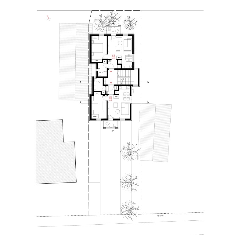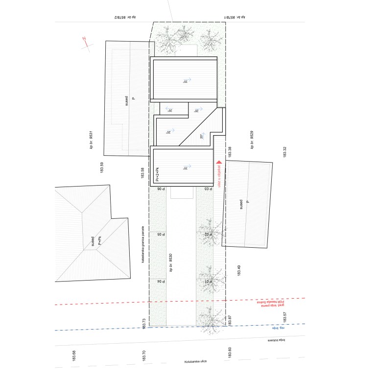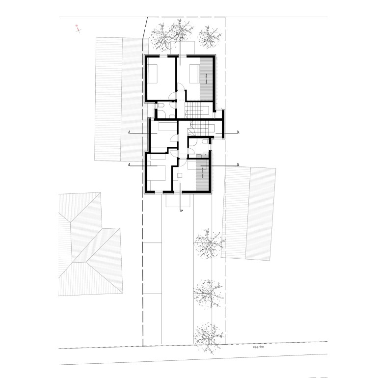 Due to the plot width, which is significantly narrower than other plots in the street, the regulation rules paradoxically conditioned the construction of a house in a row, despite the detached houses surrounding.