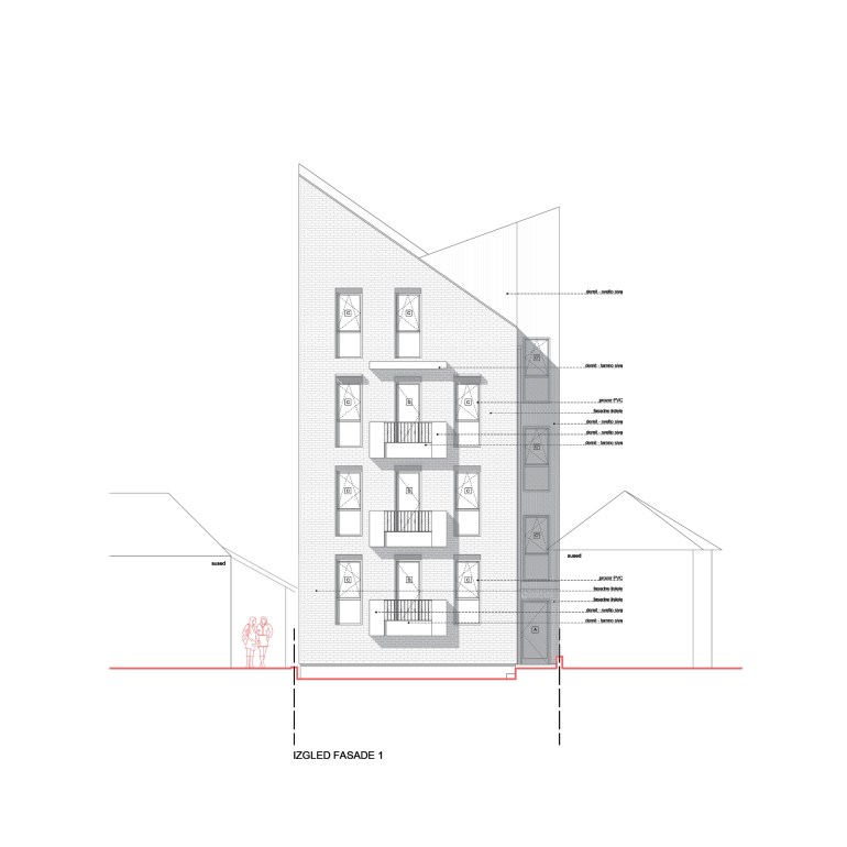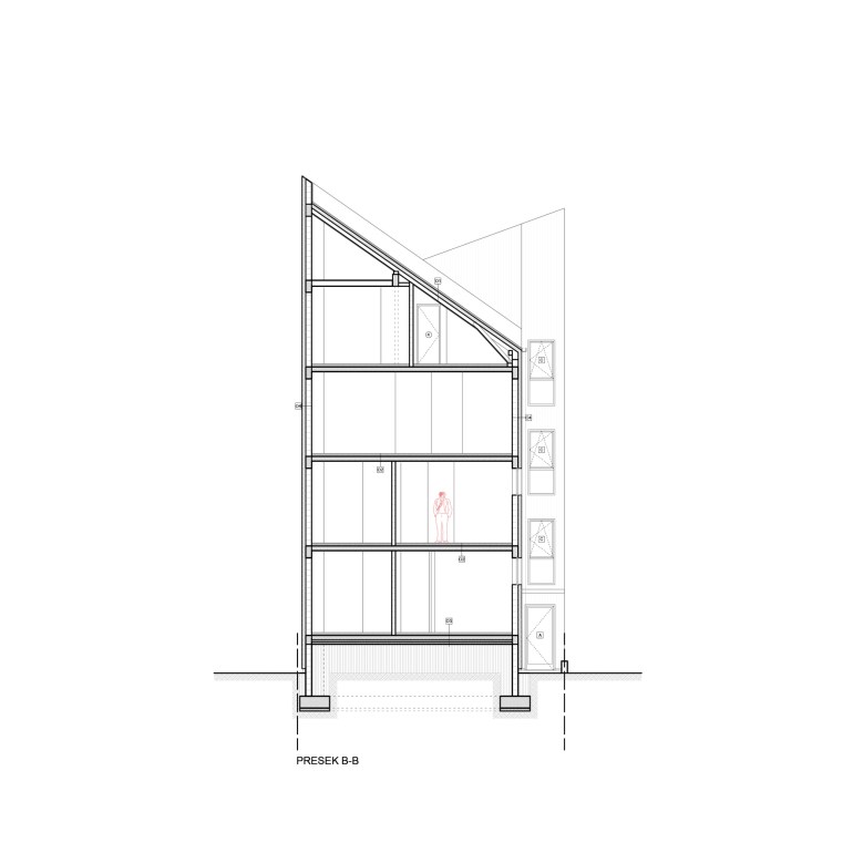 Distancing from the neighboring buildings enabled the realization of the project task, defining that the building should have exclusively a sloping roof, thus forming the main design motive. Since the roof planes above the residential parts fall to one side, and the roof above the common staircase and sanitary areas falls to the other, the sizing and proportion of the apartments can be read through the design of the building.