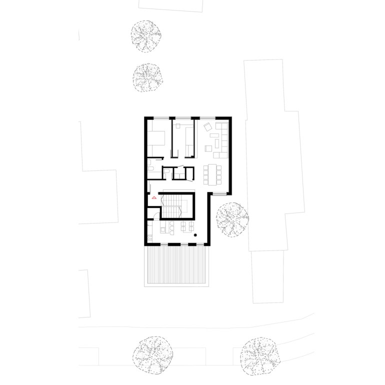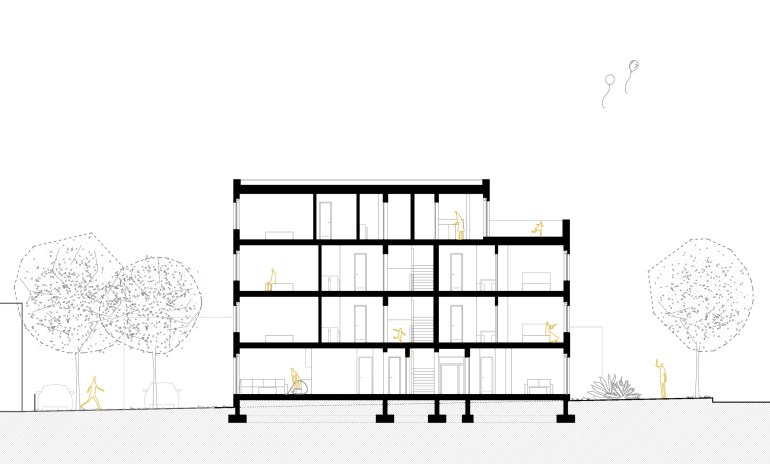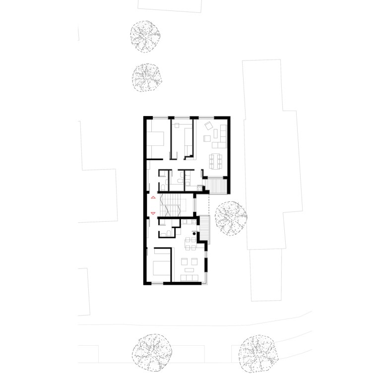 The prominent position of the plot enabled the main openings of the building towards a clean southern orientation and along the street, thus avoiding direct confrontation with the multi-story building across the street, which is so close that it casts a shadow on the street facade of K8. By retracting the terraces in relation to the building regulation, more favorable sunshine and privacy are achieved. The building as a whole mass is divided into smaller volumes that are more appropriate to its surroundings.