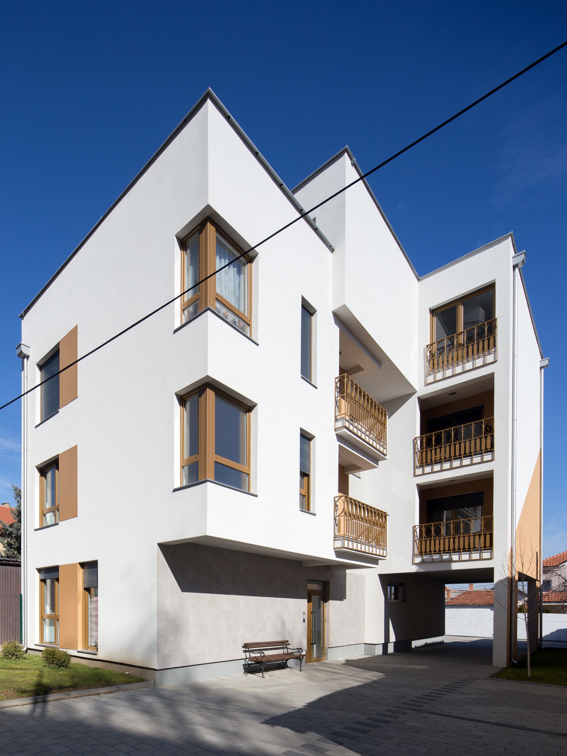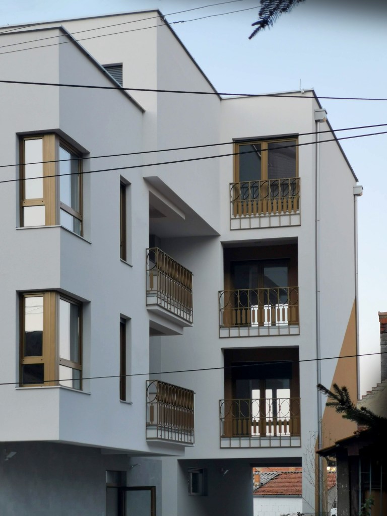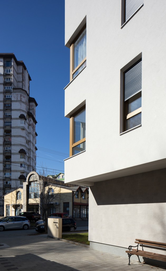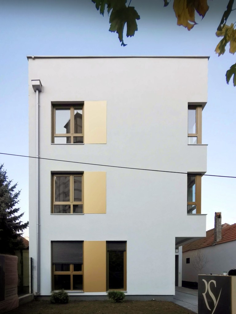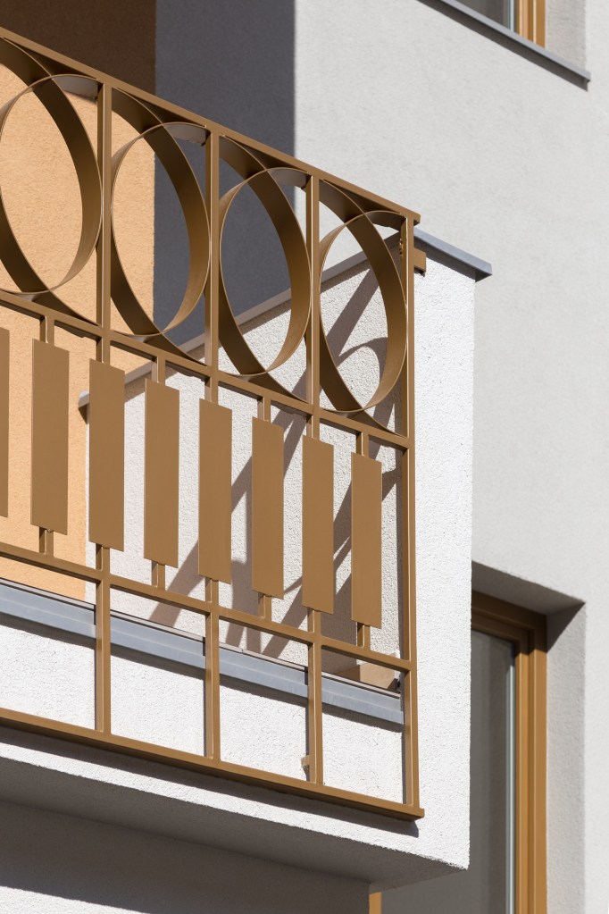 The building does not have superfluous details, but the main theme is subtly drawn in the use of “golden” paint on the windows, alubond inserts on the facade, fences, and selected facade surfaces. The courtyard facade is completely painted in gold, in contrast to the street facade, and thus opens a new dimension of the softened appearance of the building. The fence is specially designed so that from certain angles it creates a heightened sense of privacy, while seen from the inside it looks transparent. Painted in gold, the handcrafted fence gives the impression of filigree work.