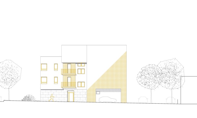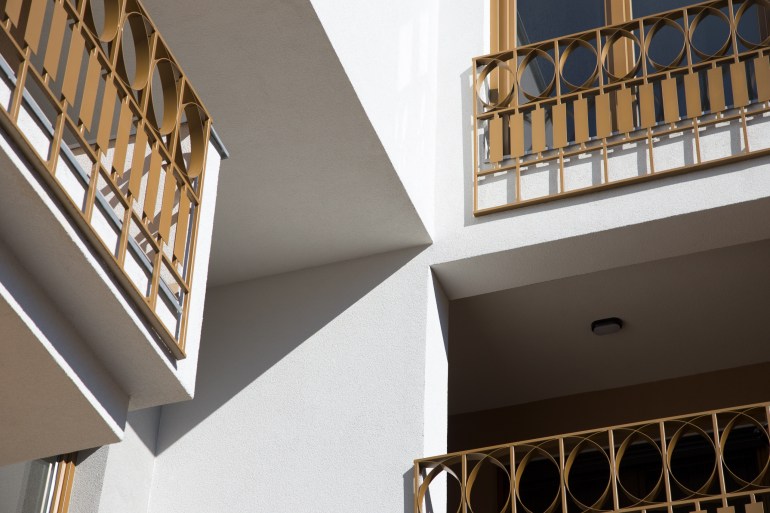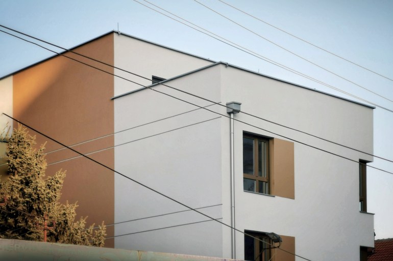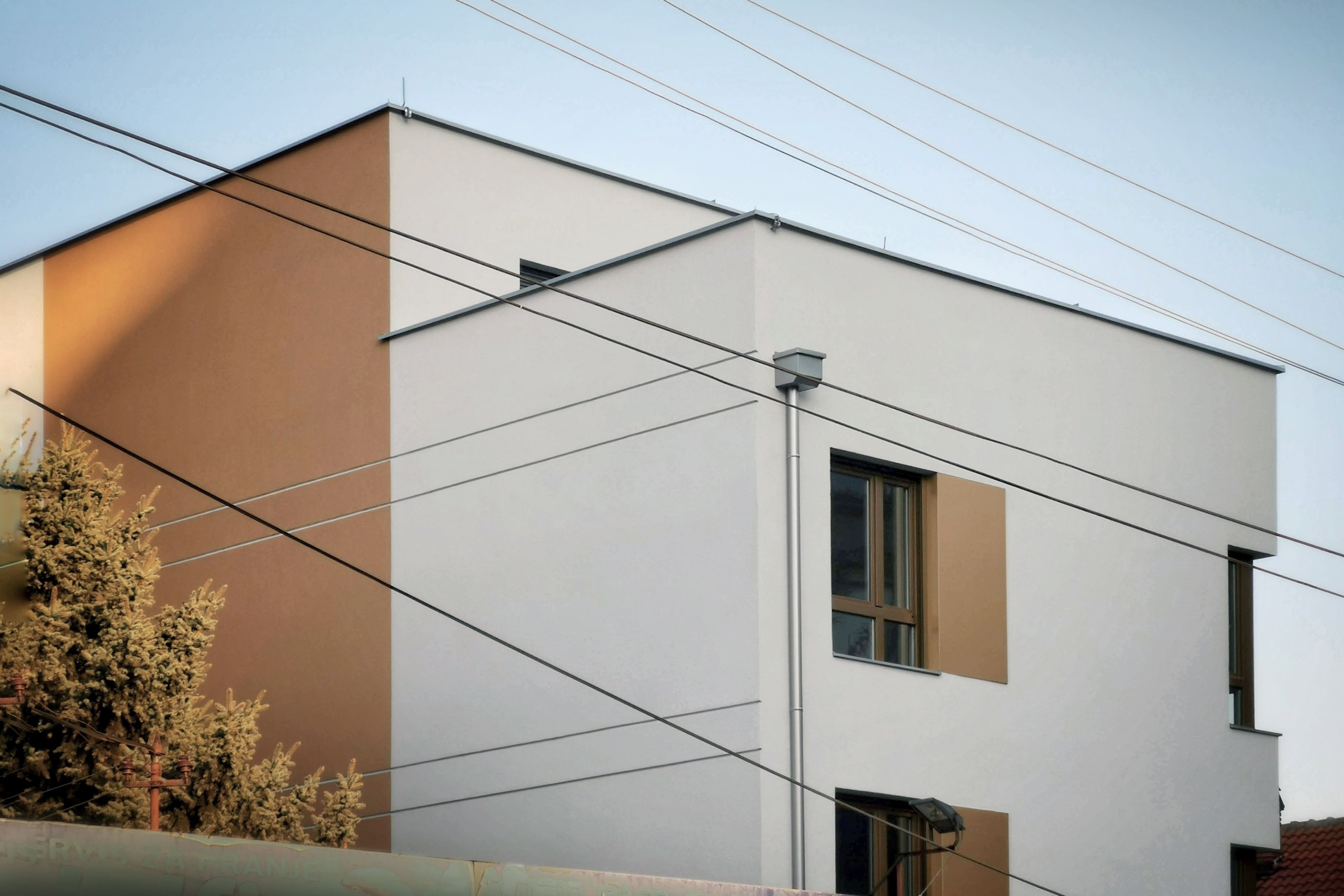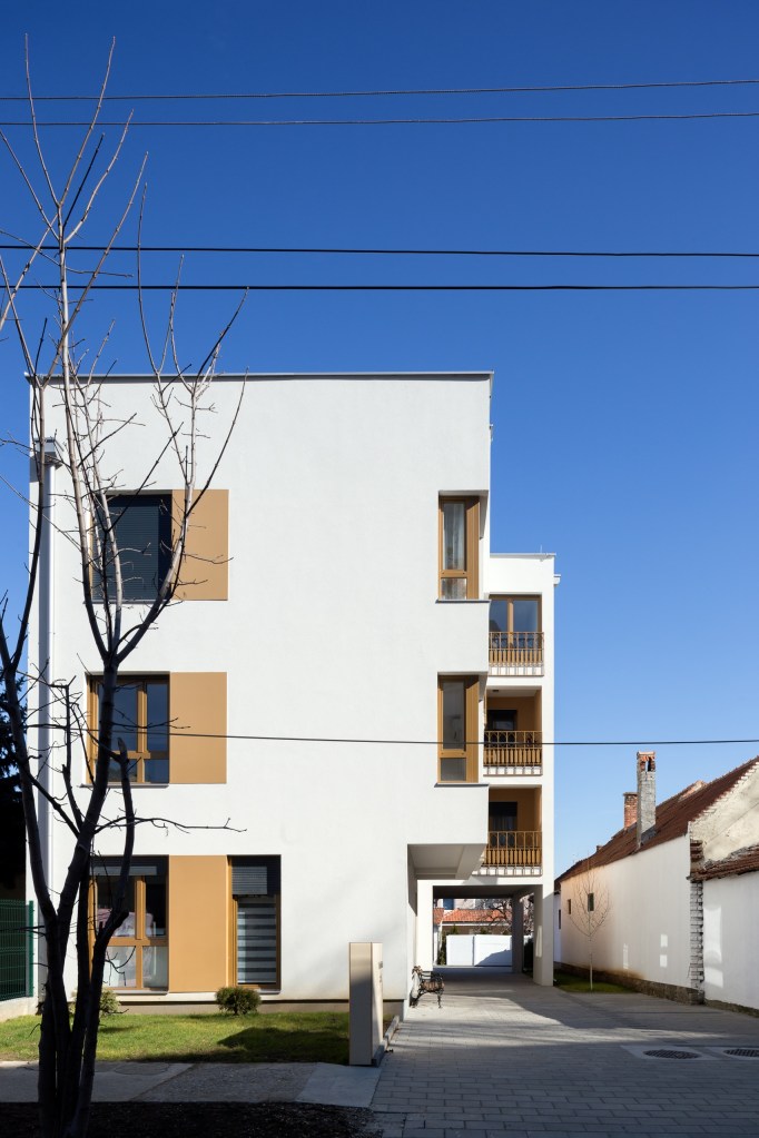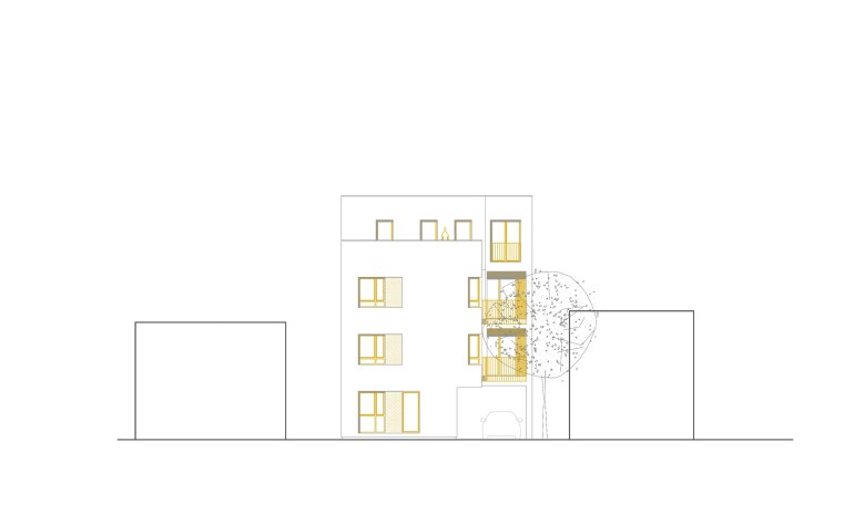 The building does not have superfluous details, but the main theme is subtly drawn in the use of “golden” paint on the windows, alubond inserts on the facade, fences, and selected facade surfaces. The courtyard facade is completely painted in gold, in contrast to the street facade, and thus opens a new dimension of the softened appearance of the building. The fence is specially designed so that from certain angles it creates a heightened sense of privacy, while seen from the inside it looks transparent. Painted in gold, the handcrafted fence gives the impression of filigree work.