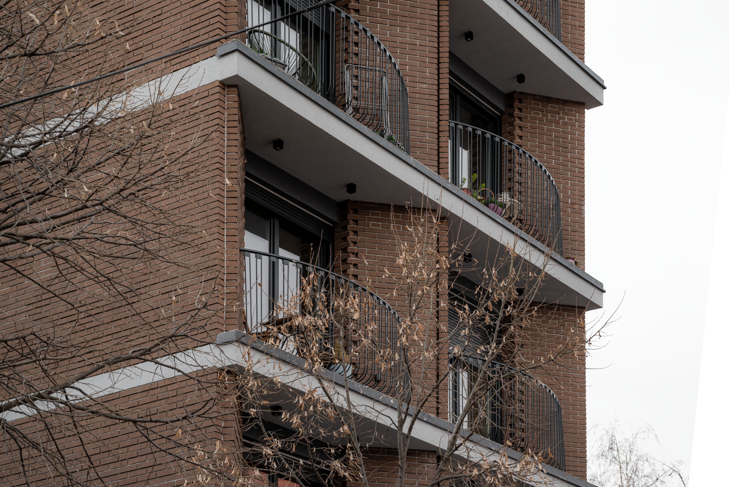 The selection of the facade treatment, and the general concept of materialising the building in a combination of brick-concrete-glass, determined the main compositional motif of the frontal facade, where the wide loggias open the apartments to the street. The rotation of the facade surfaces emphasises this opening and also allows a nice play of light and shadows at the level of different patterns of bonds and joints in brick stacking.
