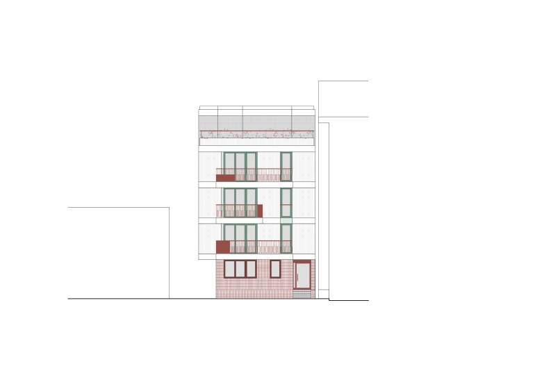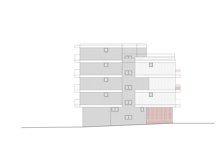 Širina fronta iskorišćena je da se na glavnoj fasadi isprojektuje ulaz u objekat, odvojen od kolskog prolaza, u materijalizaciji od klinker opekarskih elemenata na ravnom slogu koji se uvlači u unutrašnji prostor.