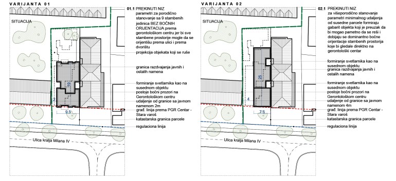 Varijanta 2: Koristeći se parametrima za prekinuti niz višeporodičnog stanovanja, udaljenje od Gerontološkog centra bi moralo biti mnogo veće, čime se dobija objekat veoma uskog fronta sa glavnim orijentacijama prema objektu Gerontološkog centra i njegovom dvorištu.