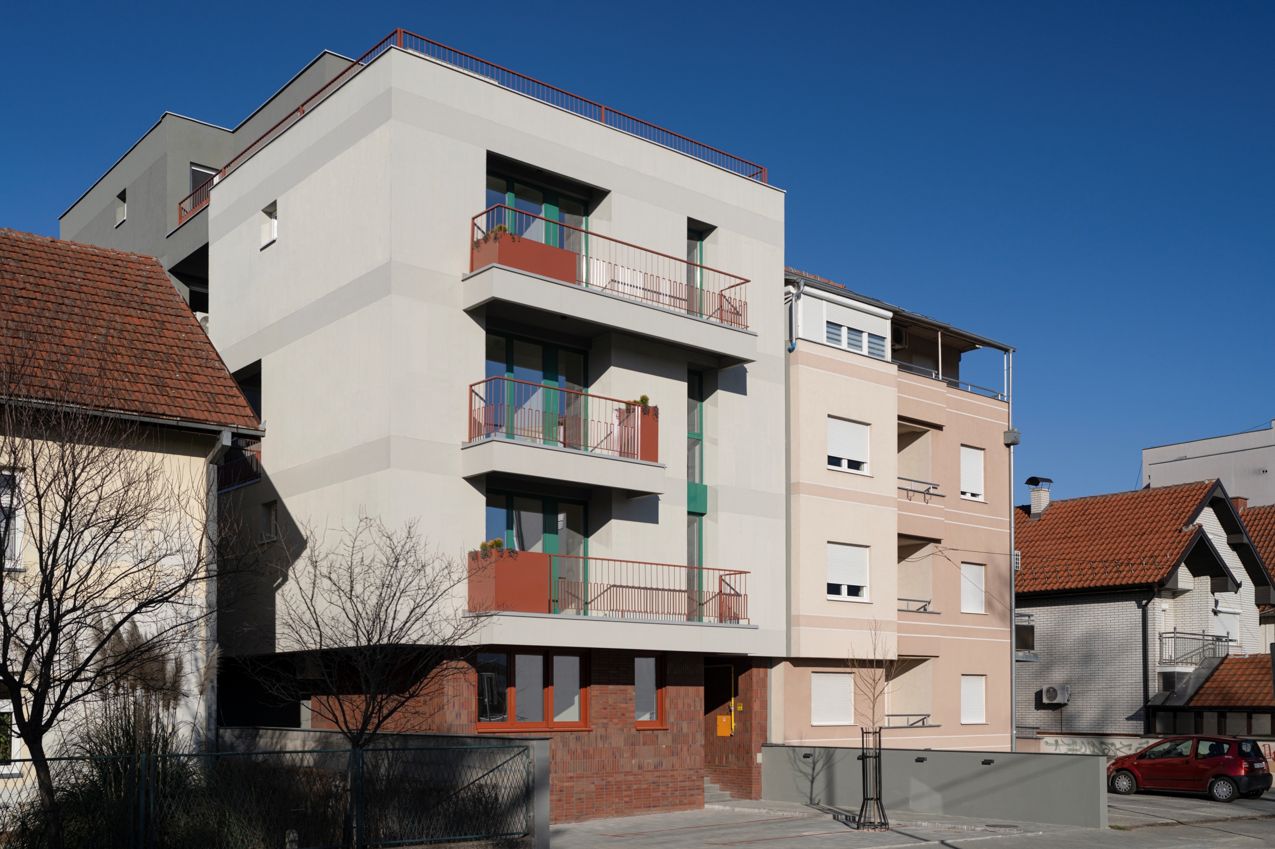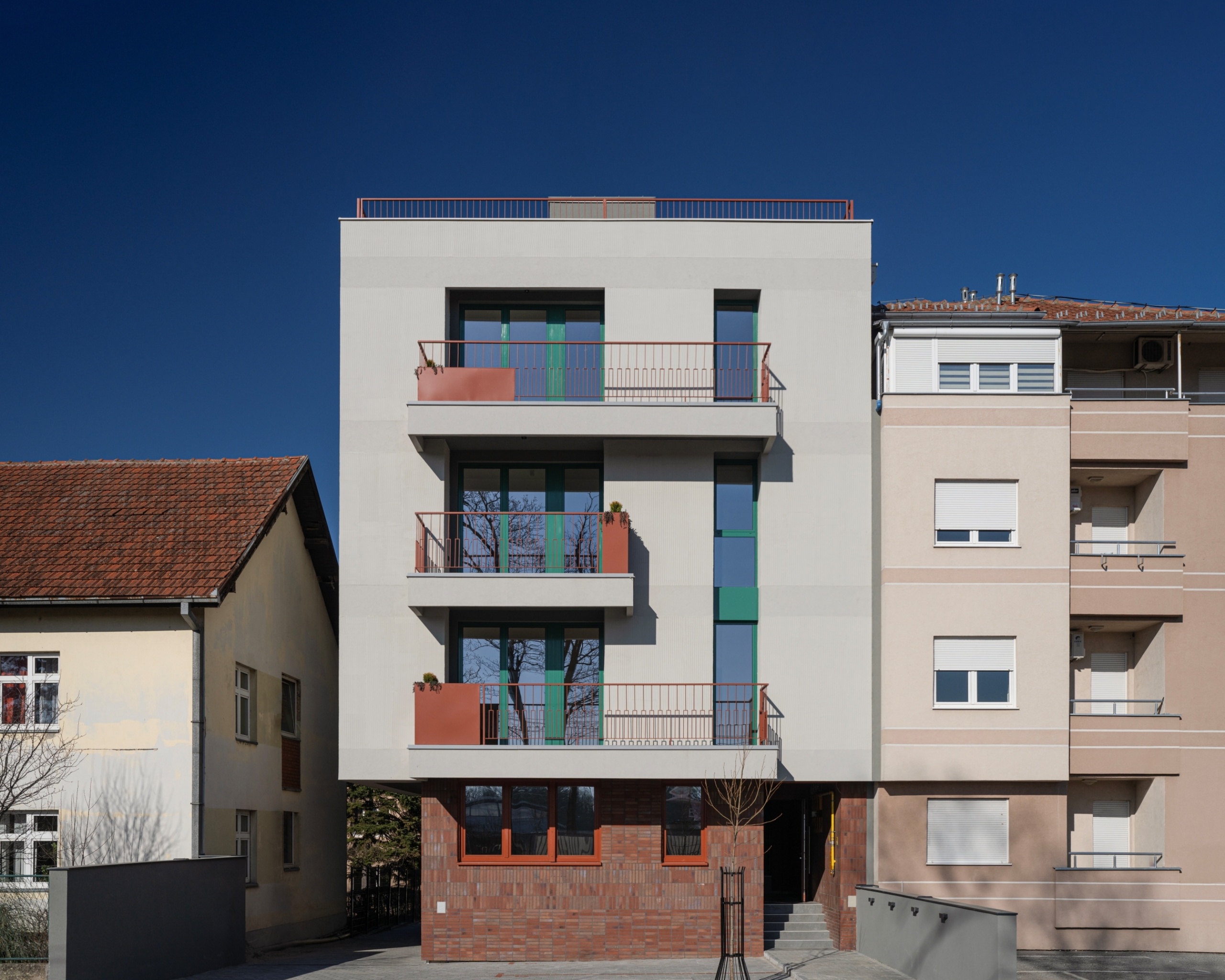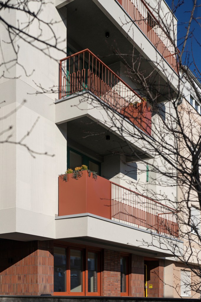 The integrally designed planters and the fence in their parts create zones of greater privacy and, against the massiveness of the facade walls, give the effect of refinement and pronounced colour, while at the same time discreetly fitting into the context.