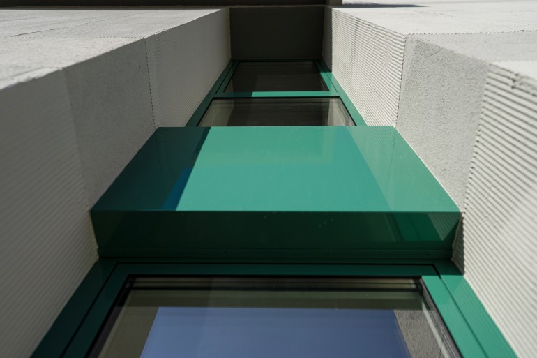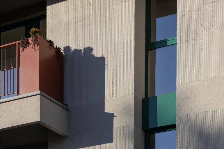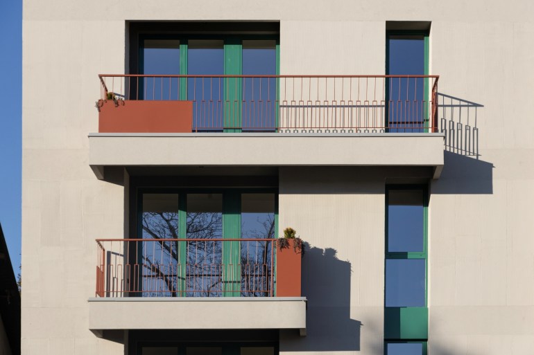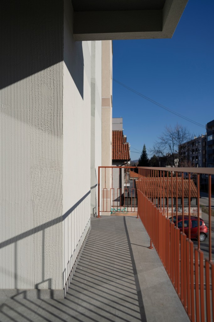 Integralno projektovane žardinjere i ograda u svojim delovima stvaraju zone veće privatnosti i nasuprot masivnosti fasadnih zidova daju efekat prefinjenosti i izraženog kolorita, dok se istovremeno diskretno uklapa u kontekst.