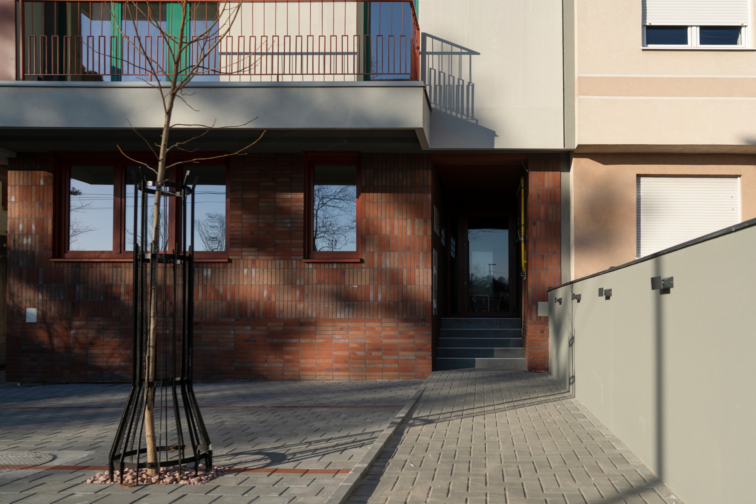 The width of the front was used to design the entrance to the building on the main facade, separated from the carriageway, materialized from clinker brick elements on a flat slab that extends into the interior space.